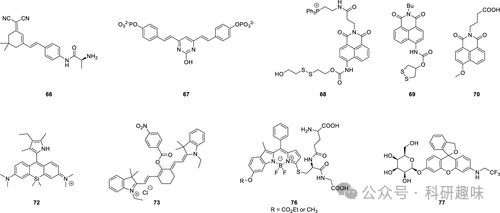 在2015年,Fan等人成功研制出两种新型荧光探针76(其中R代表CO2Et或Me),这些探针旨在特异性成像肿瘤细胞中的γ-谷氨酰转肽酶(GGT)。这些探针的分子结构由GGT特异性GSH单元和BODIPY荧光团组成。当探针穿透细胞后,GGT会裂解GSH链上的谷氨酸,通过SNAr机制触发分子内的S-N重排,生成氨基取代的BODIPY-Cys,其荧光强度显著增加(约12倍)。利用这一特性,Fan等人成功地将卵巢癌细胞与正常细胞区分开来。