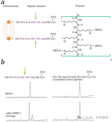 图 32.(a) MMP-2 敏感探针 93 的结构。(b) MMP-2 分解前后肽底物的 HPLC 图谱。
