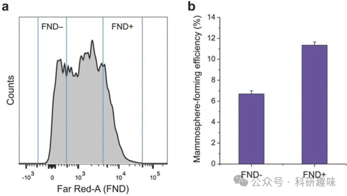 图 25.荧光纳米钻石阳性细胞(FND+)和荧光纳米钻石阴性细胞(FND-)的流式细胞分析(a)和乳球形成效率(b)。