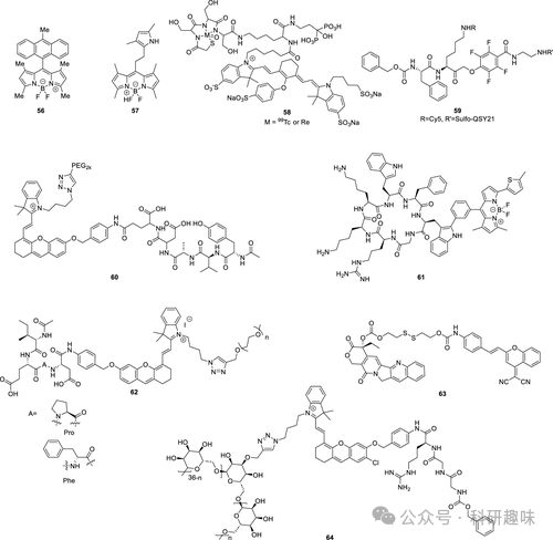 针对浸润性和非浸润性乳腺癌的区分问题,Pu和Miao等人于2020年设计出一种特异性响应浸润性乳腺癌中过表达尿激酶型纤溶酶原激活剂(uPA)的荧光探针64。该探针在酰胺键裂解去除靶向肽后,通过激活ICT机制,触发近红外荧光和PA信号。值得一提的是,探针64采用了葡聚糖骨架设计,不仅提升了溶解性,还确保了化合物能够顺利通过肾脏清除,从而极大降低了潜在毒性。葡聚糖骨架及其在传感和治疗学中的应用将在后续部分进行深入探讨。