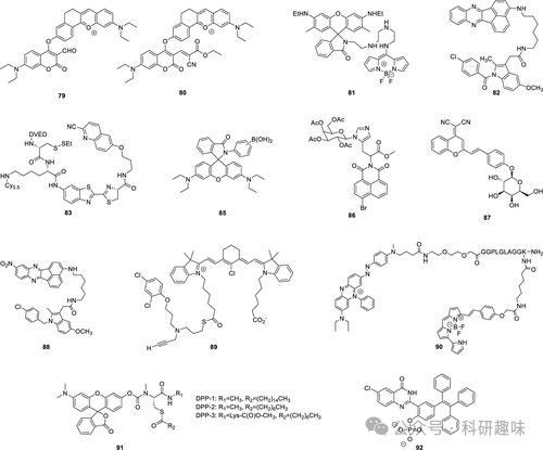 2013年,Peng等人开发了一种针对癌细胞高尔基体中环氧化酶-2(COX-2)的荧光成像探针82。该探针82结合了荧光团苊[1,2-b]喹喔啉(ANQ)和吲哚美辛(一种高效的COX抑制剂)作为COX-2的靶向基团。在水溶液中,探针呈现折叠构象,ANQ与IMC单元之间的PeT效应导致ANQ荧光淬灭。然而,一旦探针与高尔基体上的COX-2结合,其构象展开,PeT淬灭受到抑制,荧光得以恢复。Peng等人利用探针82成功地对不同细胞中的COX-2活性进行了成像,并快速区分了正常细胞和癌细胞(HeLa细胞)。此外,该探针还可用于观察肿瘤细胞凋亡过程中高尔基体的动态变化。