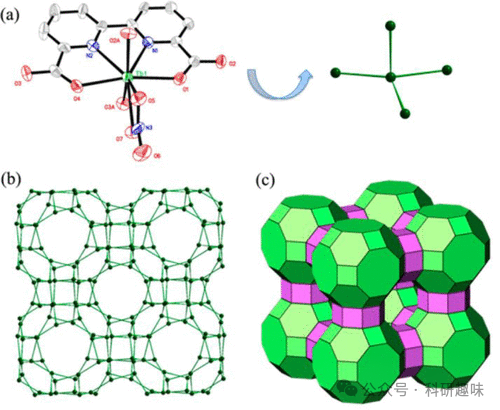 图 29.(a) Tb-ZMOF 的晶体结构(探针 78)。(b)Tb-ZMOF 中 α 笼和β笼的透视图(点 = Tb3+;线 = 羧基)。(c) Tb-ZMOF 的 rho 拓扑平铺图。