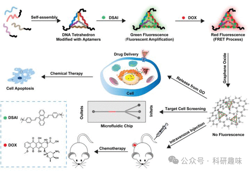2021年,Tang等人成功研发了一种基于氧化石墨烯的荧光纳米材料(探针71),专门设计用于体内肝癌的高效诊断与治疗。该创新材料由几个关键组件构成:首先,通过自组装技术,适配体修饰的ssDNA形成稳定的DNA四面体(DNA-tetra)结构;其次,该结构被赋予化疗药物多柔比星(DOX)和基于聚集诱导发光(AIE)的荧光团DSAI。这一设计中,DOX与DSAI间的荧光共振能量转移(FRET)过程显著增强了DOX的荧光信号,使得整个纳米材料在激发下发出明亮的红色荧光。