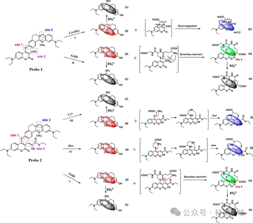 在2020年,Yin等人提出了两种新型荧光探针79和80,它们在同一通用支架上通过引入不同的反应位点,实现了对宫颈癌中硫醇和二氧化硫生物标志物的差异化监测(图 31)。这些探针的设计精妙,基于三个关键的反应位点。反应位点一作为两者的共有特征,由双芳醚连接构成,其可以通过与Cys、Hcy或GSH硫醇的相互作用进行裂解,进而产生发出红色荧光的五环吡咯荧光团。随后,这一物质会与反应位点三中的SO32-(SO2供体)发生反应,通过磺酰化作用打破共轭体系,从而抑制红色荧光。而反应位点二则是每种探针所独有的,它涉及与醚连接体裂解产生的硫醇化合物发生分子内反应,形成新的环状硫醚香豆素,并发出蓝色荧光。特别地,在第二个探针中,GSH的加入会触发一系列反应,生成一个含有噻吩和亚胺的绿色荧光物质,该物质在进一步与SO32-反应时会分解。图 31详细展示了这一复杂的级联反应过程。
