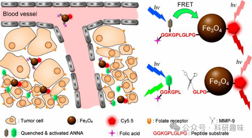 当肿瘤相关的蛋白酶MMP-9发生作用,特异性裂解多肽序列时,FRET机制被中断,导致ANNA的荧光得以恢复,从而指示蛋白酶MMP-9的活性。通过比较恒定发光的Cy5.5与依赖于MMP的ANNA的荧光强度,可以精确地量化MMP-9的活性。