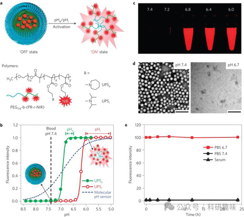 图 28.(a) UPSe(探针 74)和 UPSi(探针 75)的结构。(b) UPSe 和 UPSi 纳米探针的归一化荧光强度与 pH 值的函数关系。(c) UPSe-Cy5.5 纳米探针溶液在不同 pH 值缓冲液中的荧光图像。(d) UPSe 纳米探针的透射电子显微照。(e) UPSe 纳米探针的稳定性实验。
