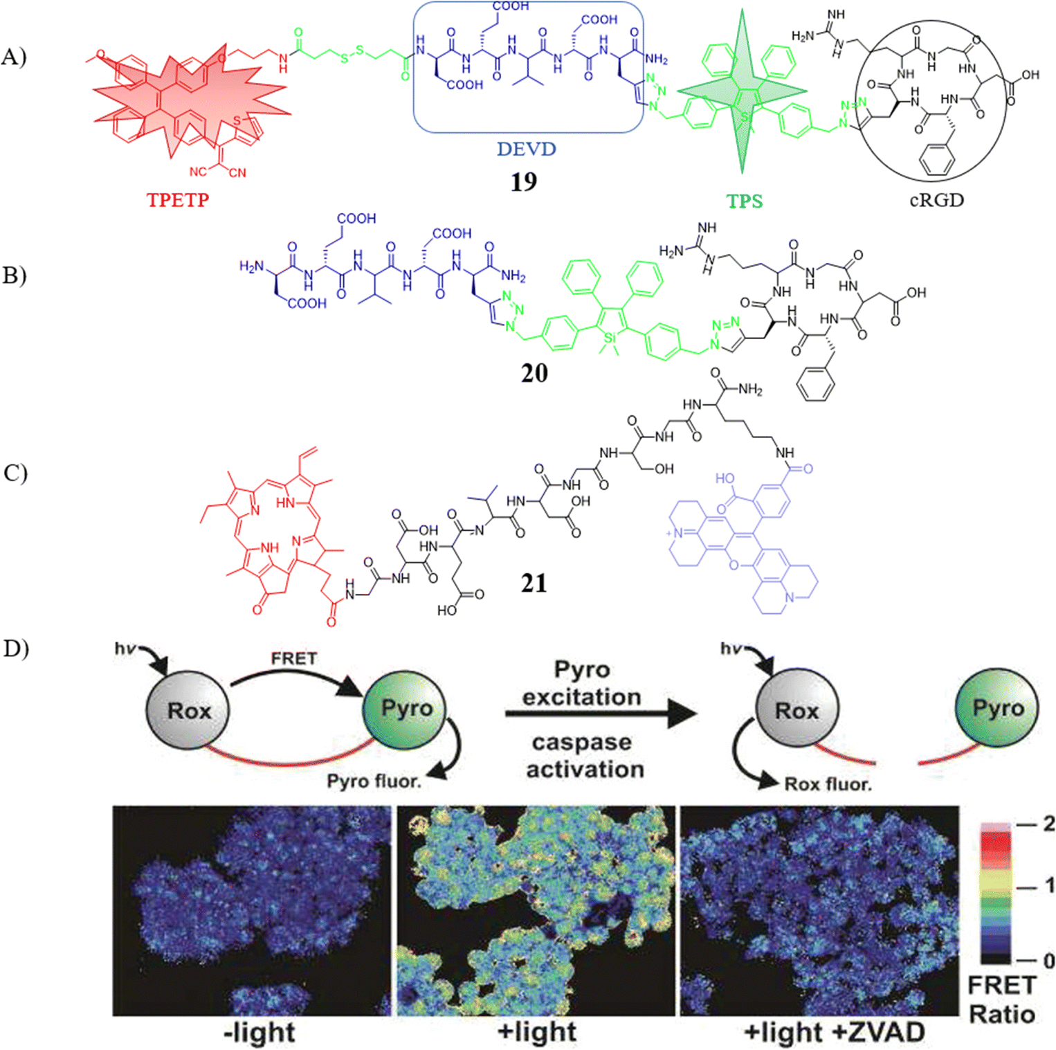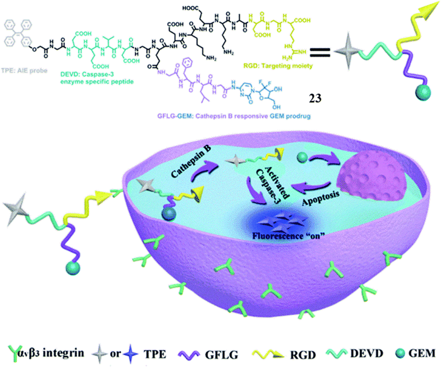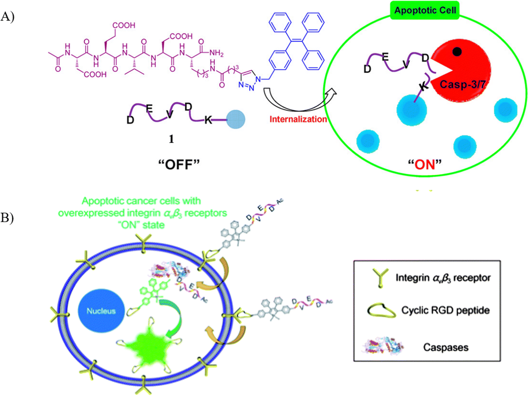 | 19 | Caspase-3/-7 | AIE | DMSO/PBS (v/v = 1/199) | 365/480 | 2.3 × 10−12 M | 60 min | αvβ3 integrin | MDA-MB-231 cells, MCF-7 cells, 293T cells | |