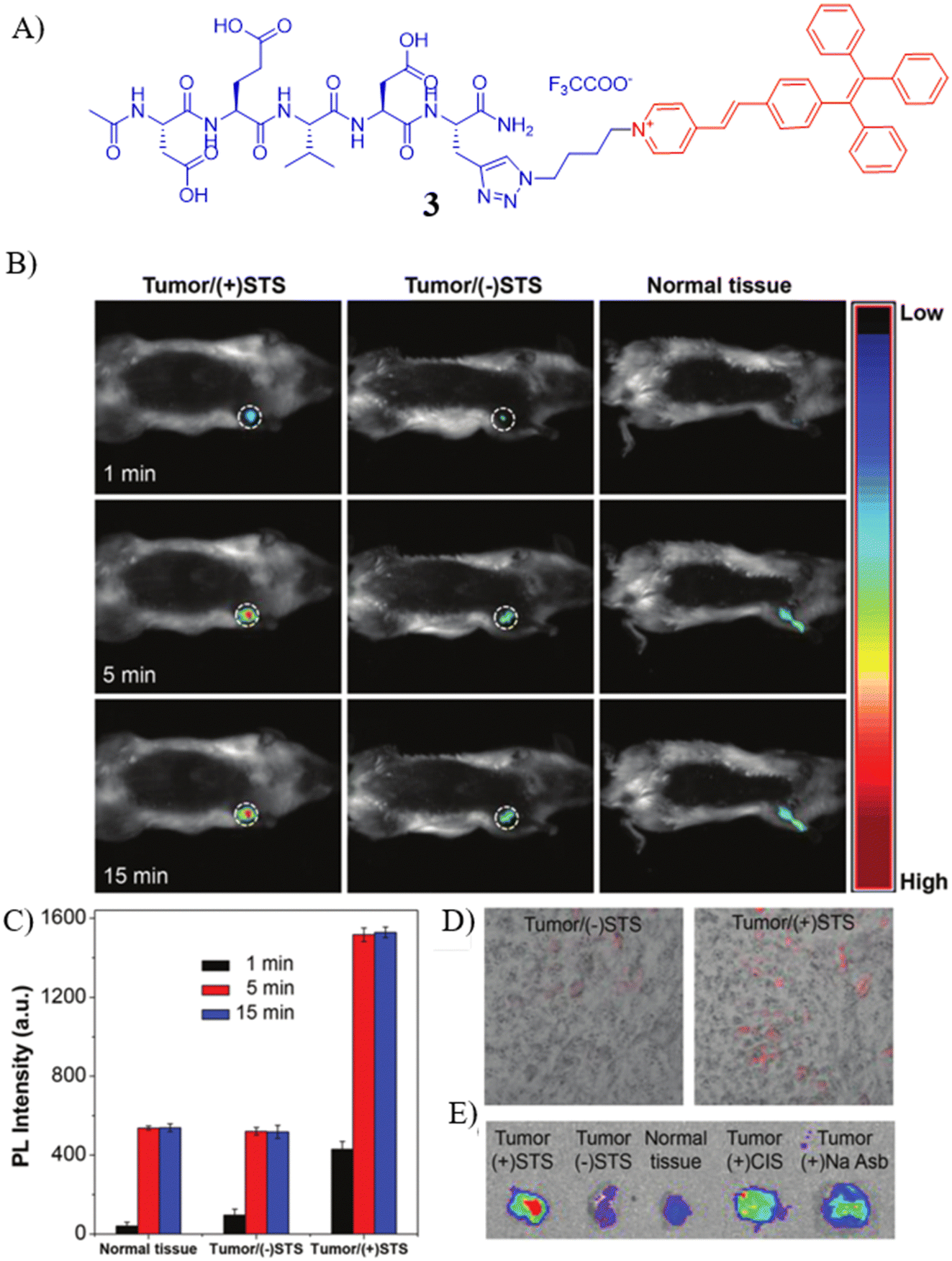 | 3 | Caspase-3/7 | AIE | PIPES buffer (pH = 7.2), 37 °C | 405/610 | — | ∼40 min | — | MCF-7 cells, mice | |