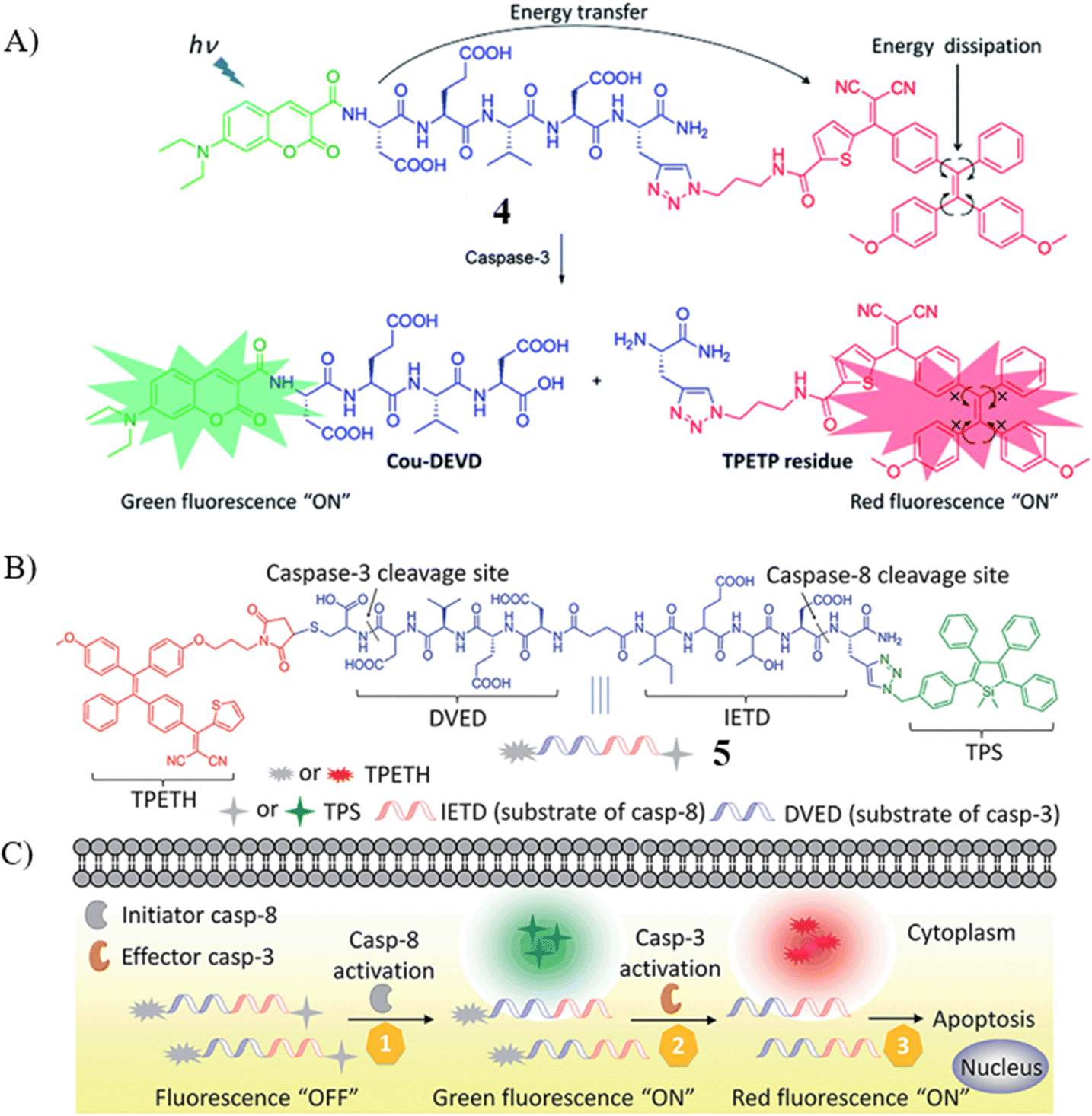| 10 | Caspase-3 | FRET/AIE | PBS (pH = 7.4), 37 °C | 520/∼580 | — | ∼4 h | — | HeLa cells | |