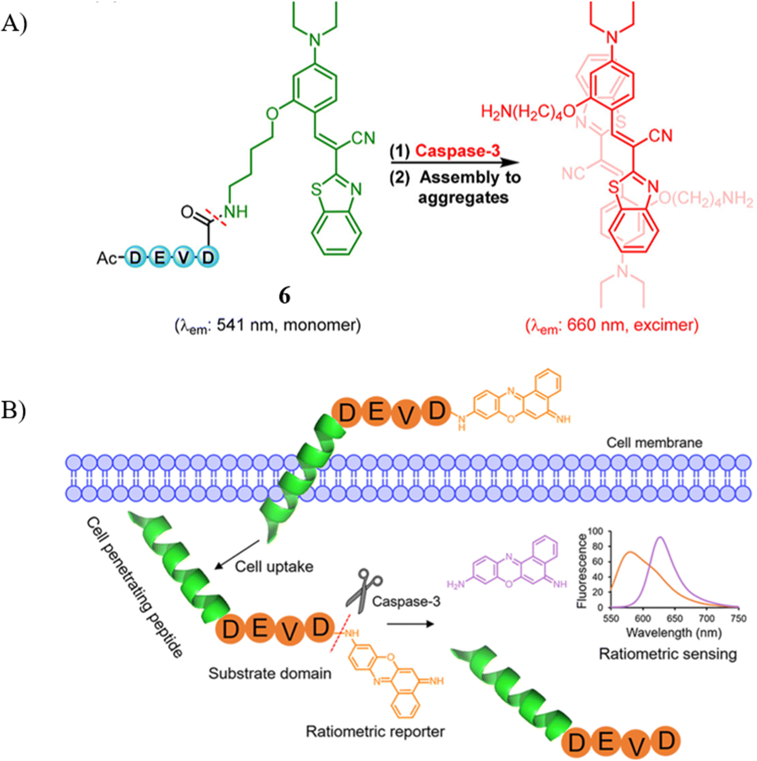| 7 | Caspase-3 | Ratiometric | PIPES buffer (pH 7.4), 37 °C | 528/582, 628 | 5.3 pM | 30 min | — | HeLa cells | |