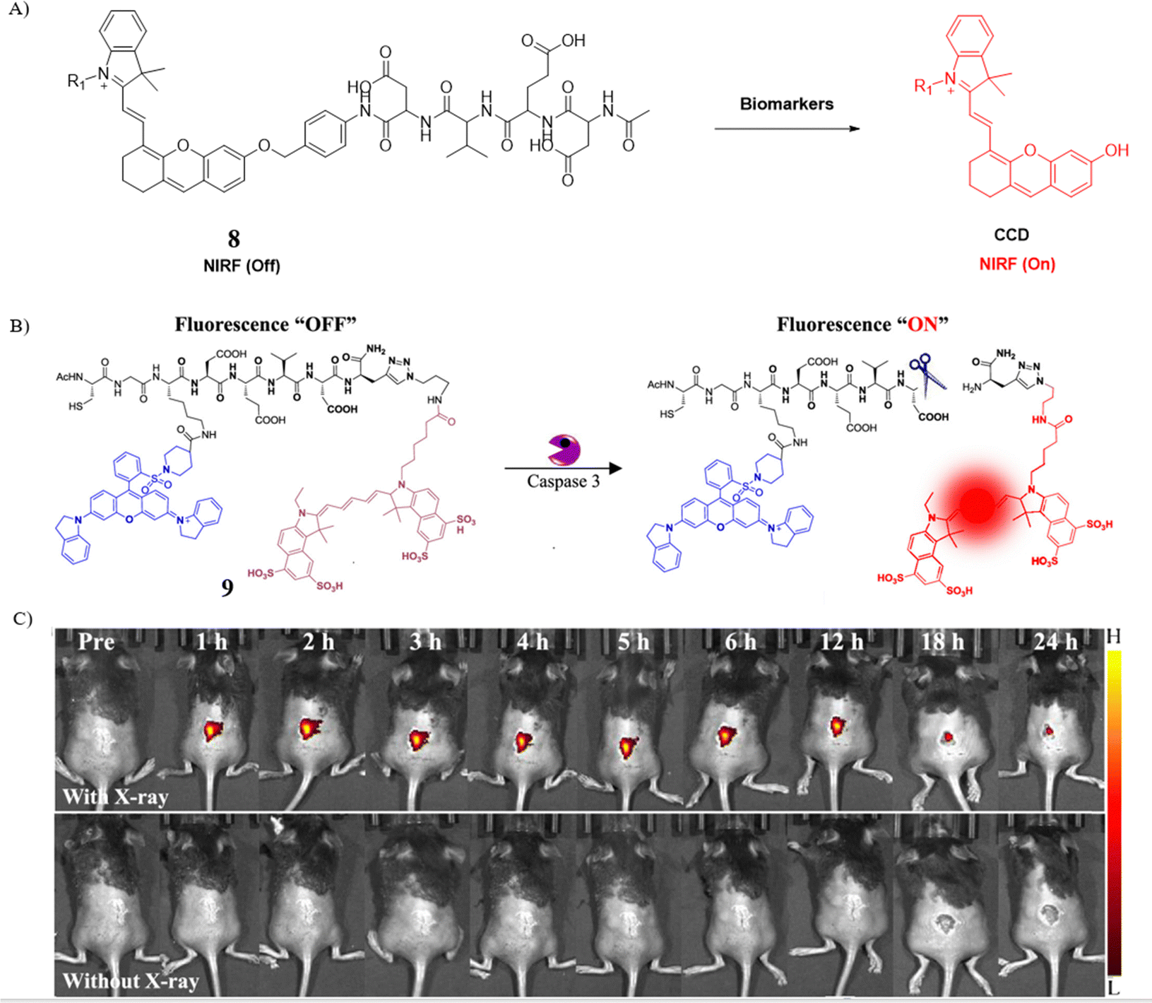 | 8 | Caspase-3 | — | PBS (10 mM, pH 7.4) at 37 °C | 675/720 | — | — | Kidney | Mice | |