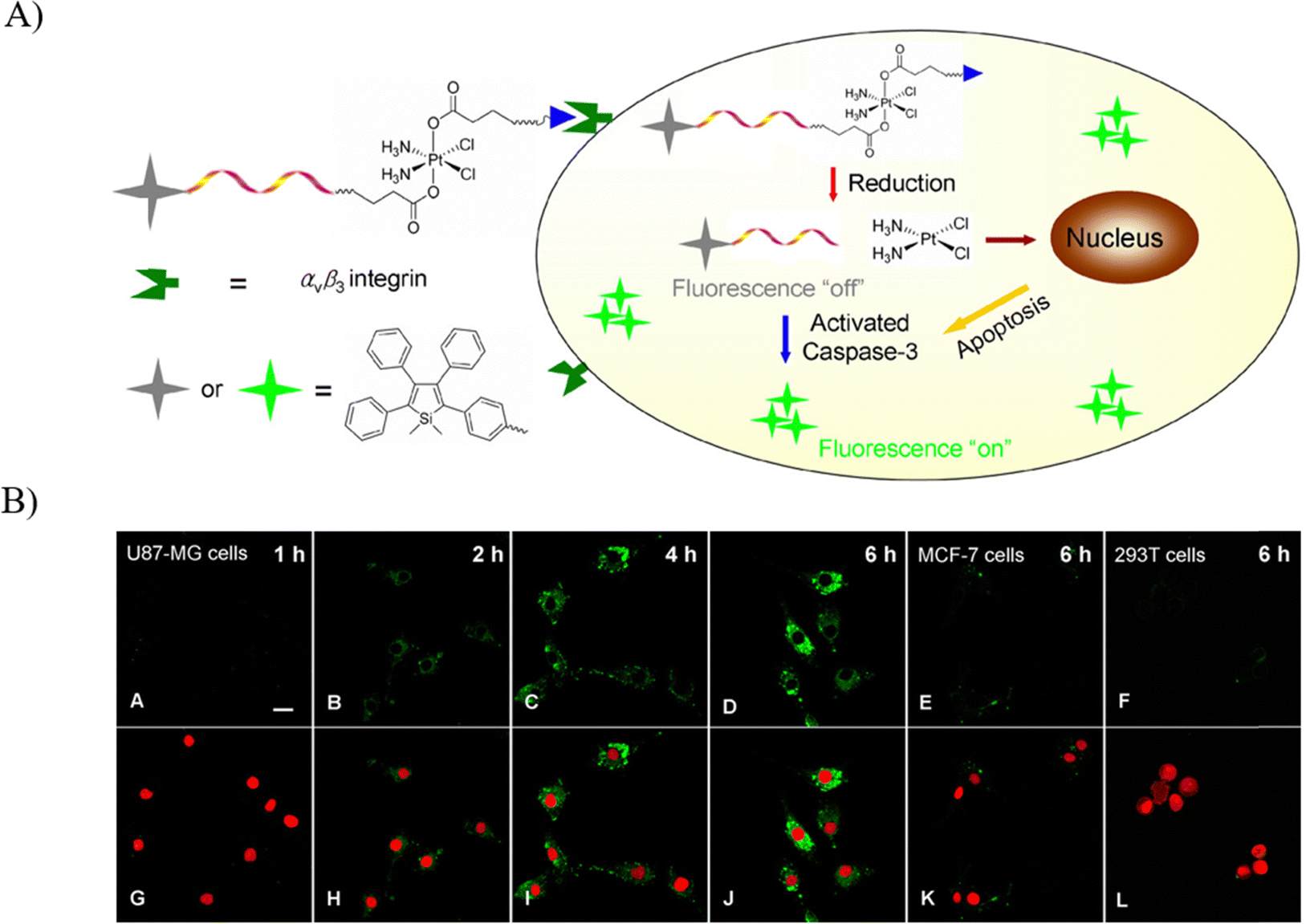 | 18 | Caspase-3 | AIE | DMSO/PIPES (v/v = 1/199) | 365/480 | 1 pM | 60 min | αvβ3 integrin | U87-MG cells, MCF-7, 293T | |