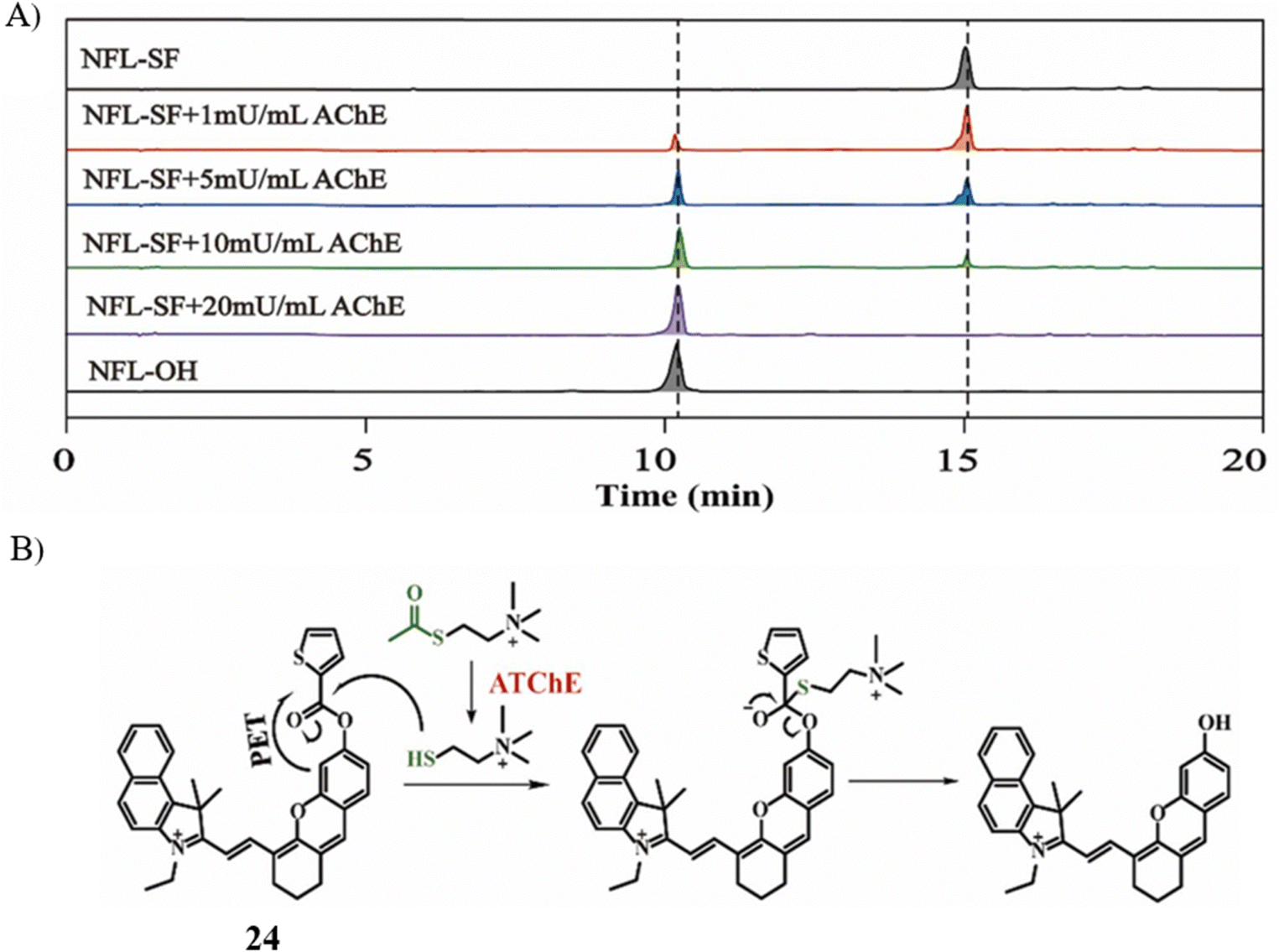 | 24 | AChE | — | PBS (pH = 7.4), 37 °C | 680/745 | 0.2 mU mL−1 | <30 min | — | HeLa cells, MCF-7 cells, mice | |