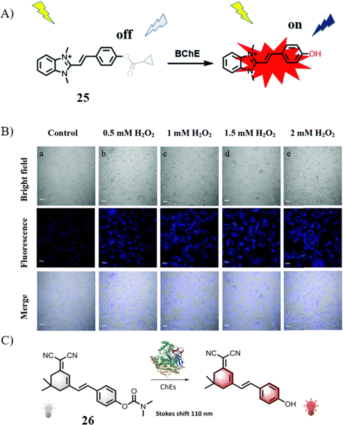 | 26 | AChE/BChE | ICT | PBS (pH 7.4, 20 mM, 50% DMSO) | 545/654 | 0.127 U mL−1; 0.0117 U mL−1 | ❤️ s | — | NHA cells, U87 cells, zebrafish, mice | |