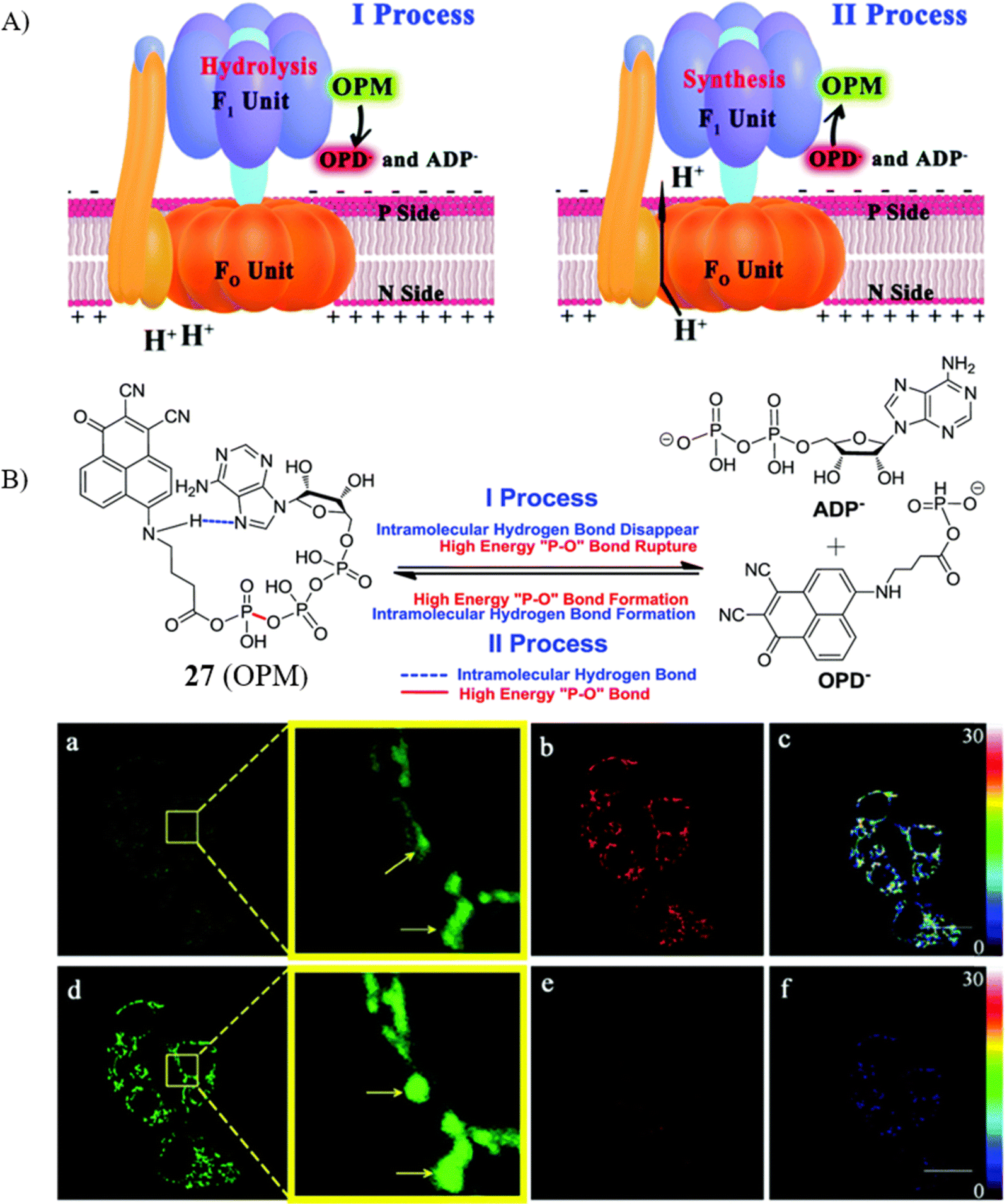 | 27 | ATPase | ICT | PBS, pH 7.4, 37 °C | 520/565 | 15.77 U | — | Mito | Different cancer cells | |