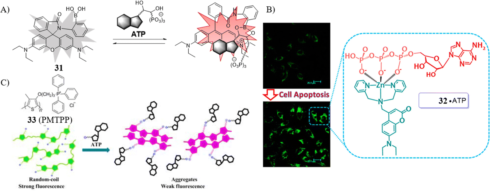 | 33 | ATP | — | 10 mM HEPES buffer solution of pH 7.4 | 410/524 | 27 nM | — | Plasma membrane | HepG2 cells, HeLa cells, HL 7702 cells, mice | |