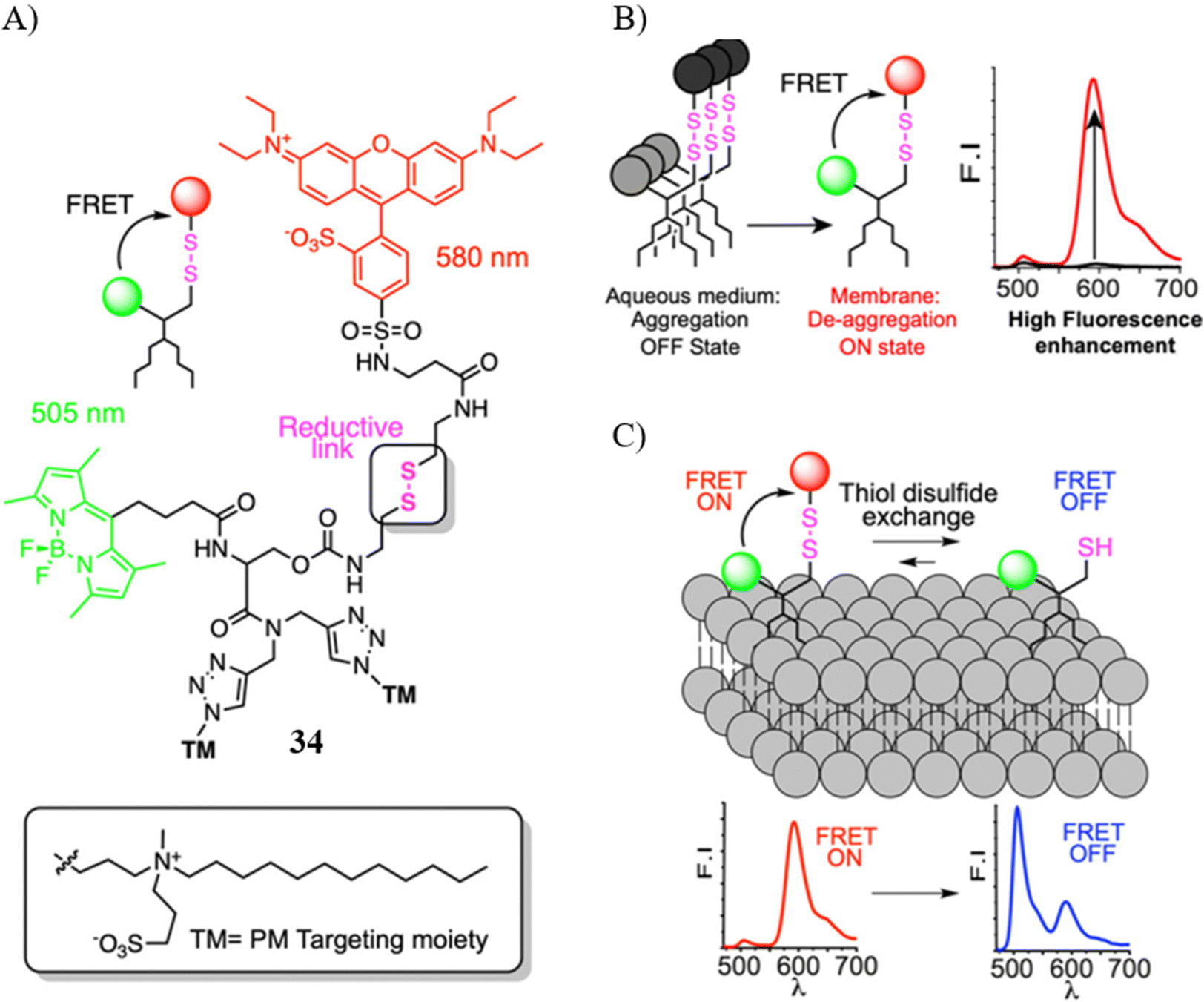 | 34 | Thiol disulfide exchange | FRET | Methanol, DMSO, phosphate buffer (pH = 7.0) | 460/504, 580 | — | ∼30 min | Plasma membrane | Various cell lines | |