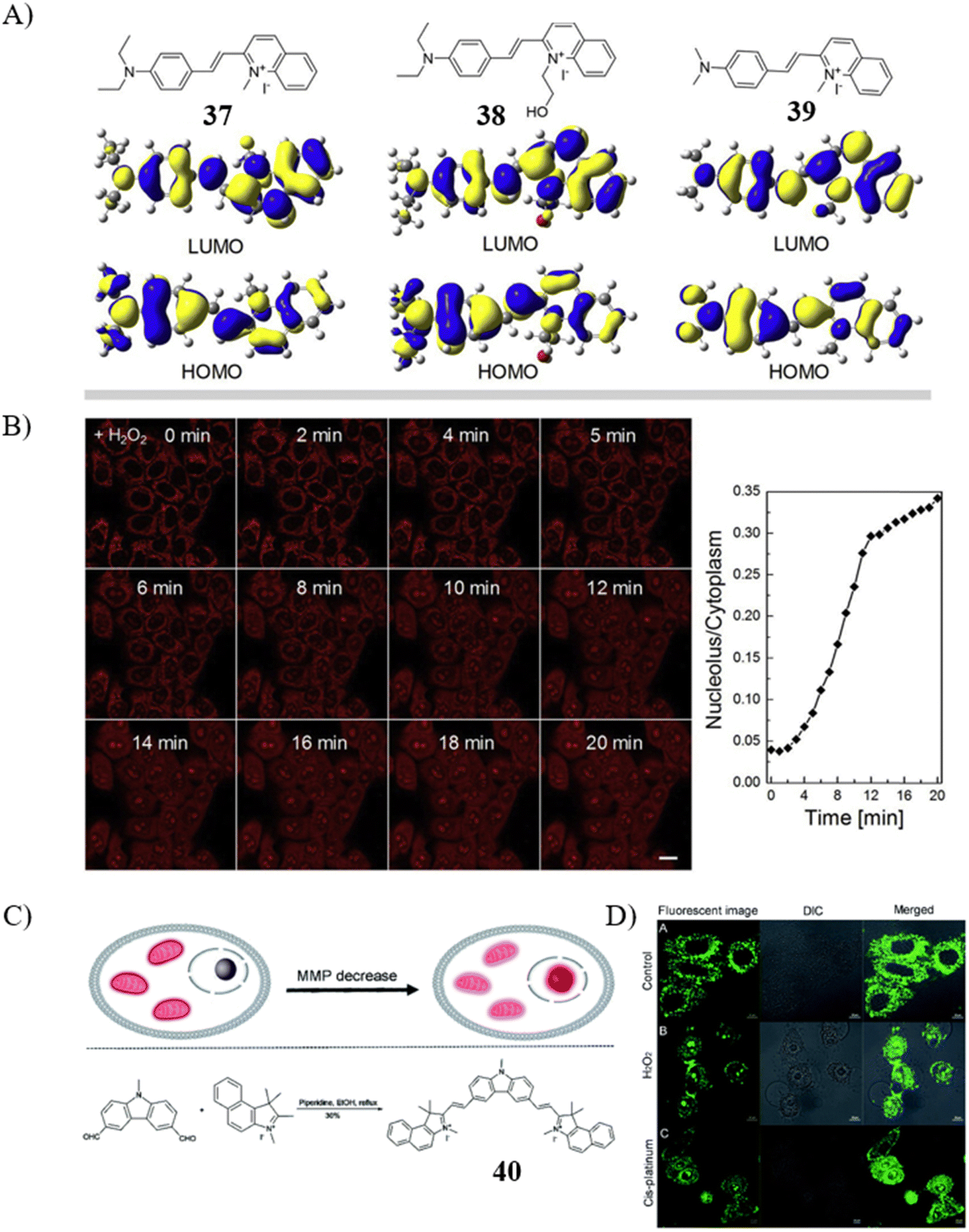 | 39 | ΔΨm | ICT | PBS (pH 7.4, 10 mM) | 500/630 | — | — | Mitochondria, nucleolus | HepG 2 cells | |