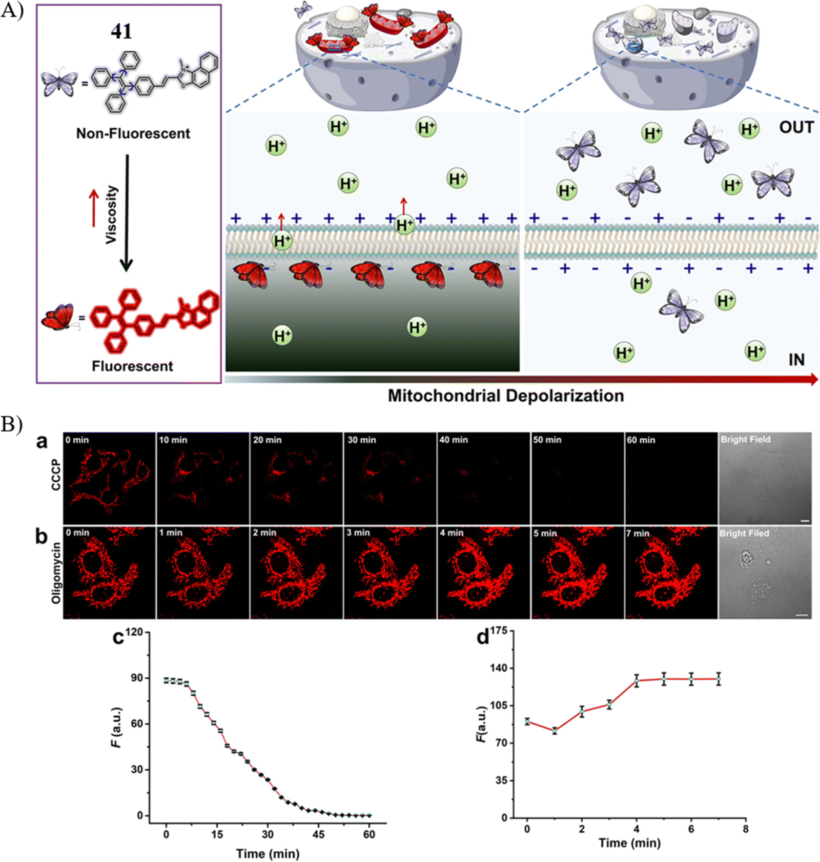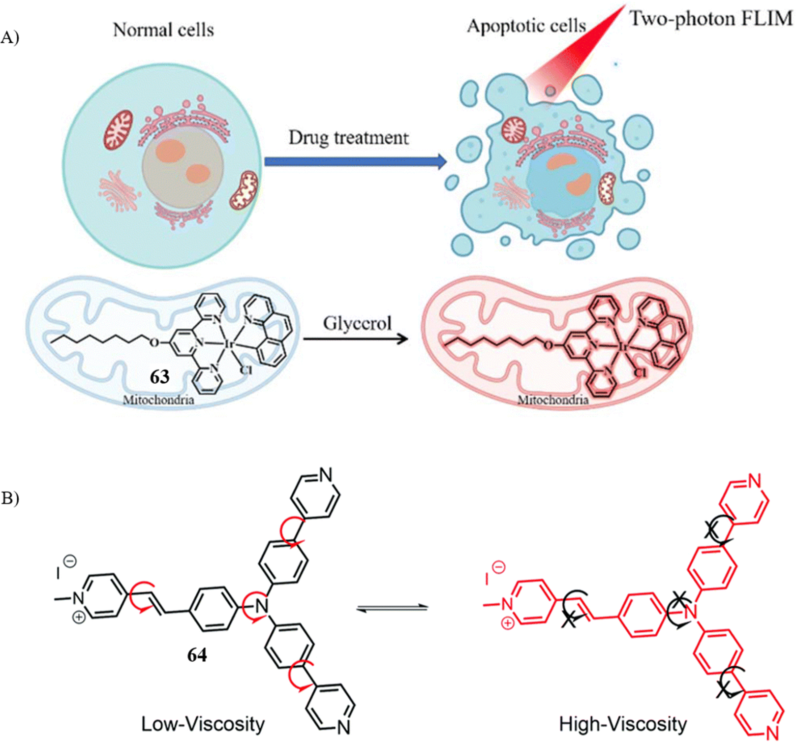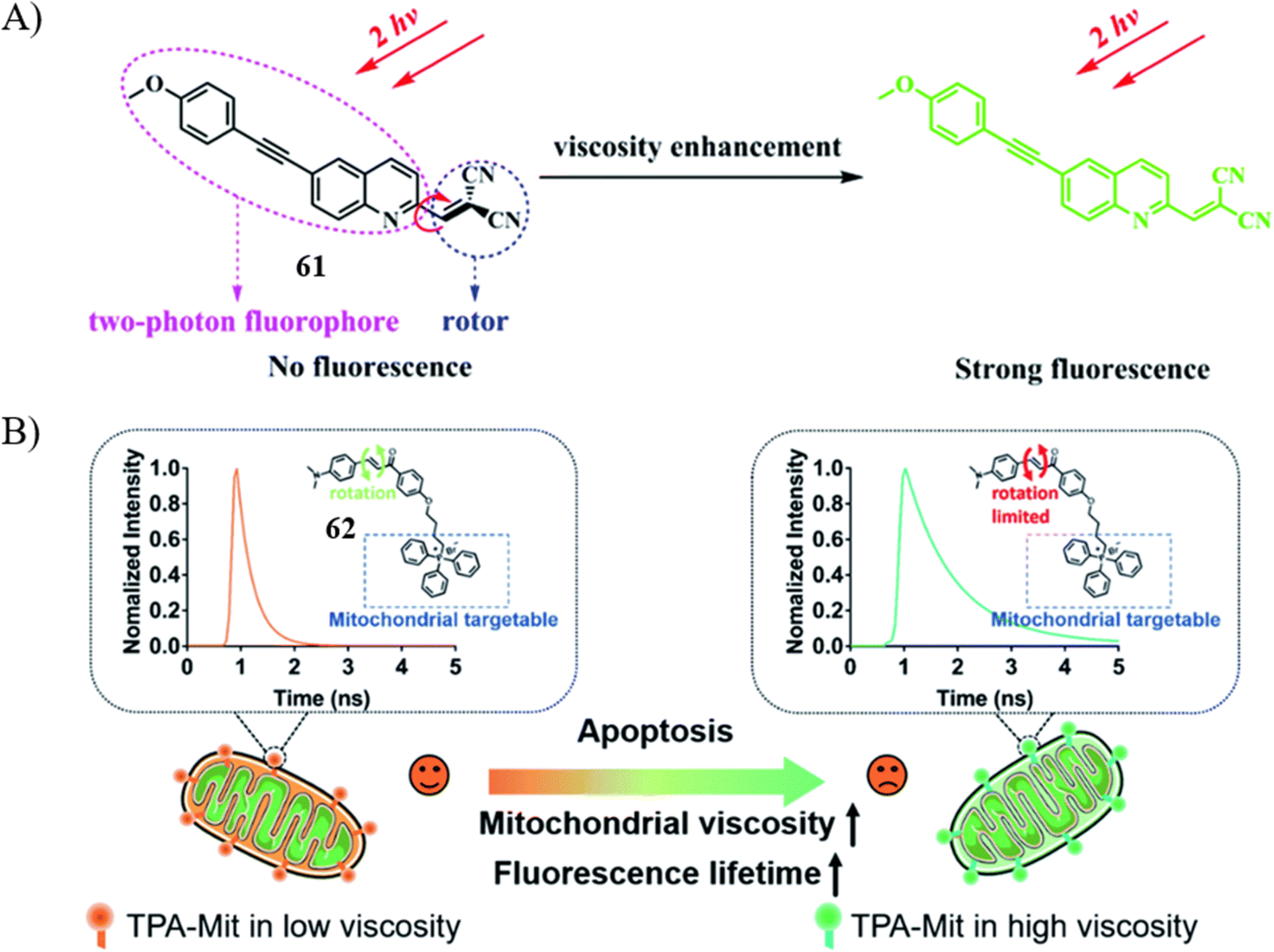 图 36 (A) 用于粘度响应的探针 61 的结构和拟议机制; (B)62(TPA-Mit)在细胞凋亡过程中用于粘度探测的结构和使用方案。