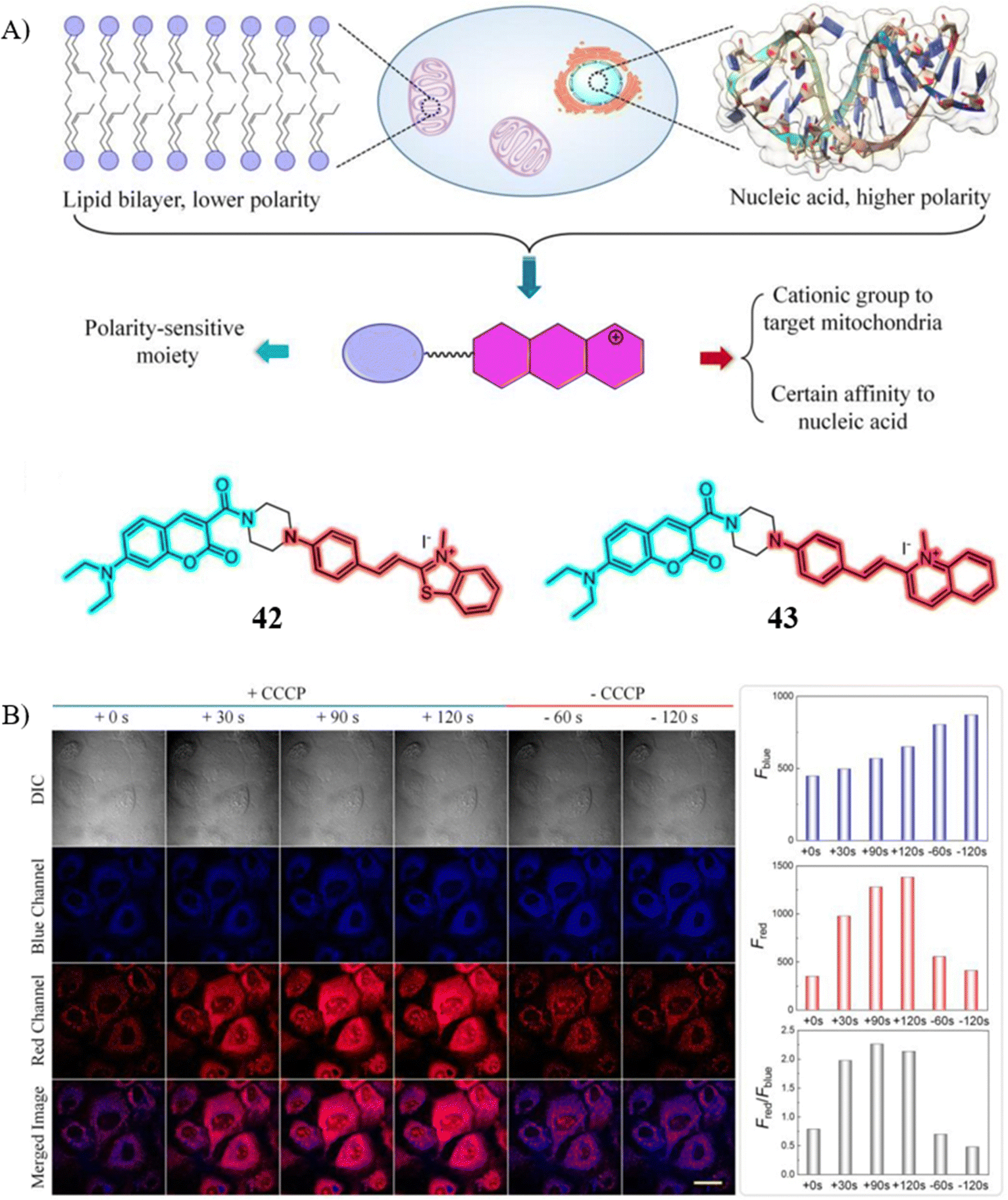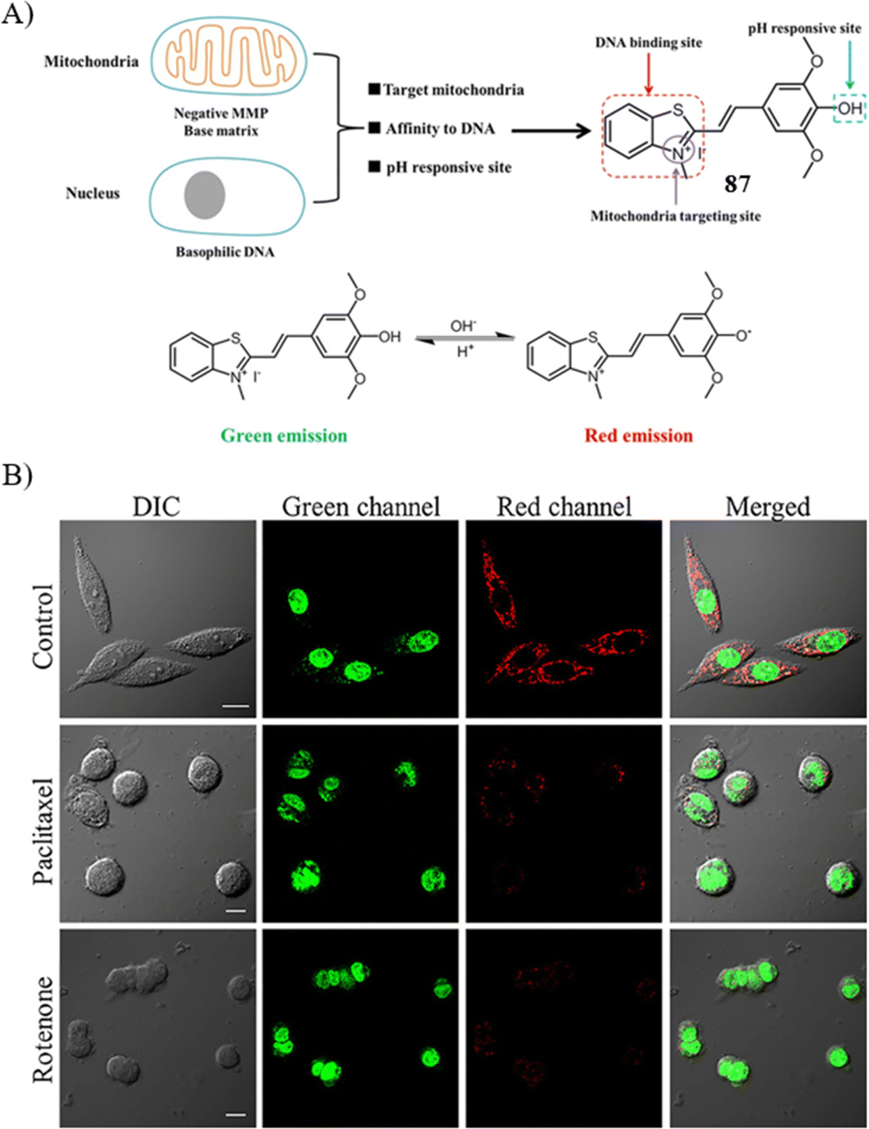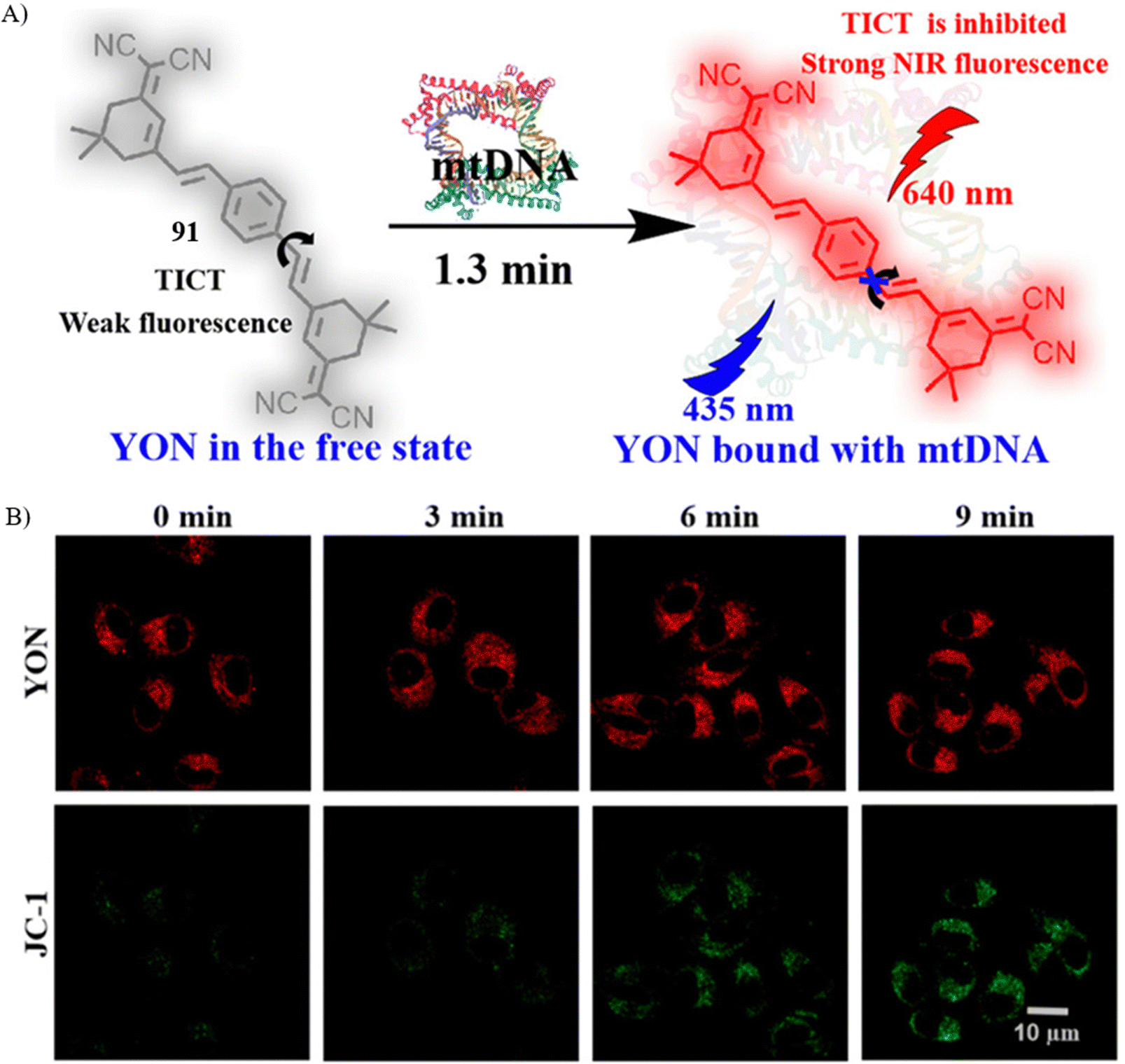 图 51 (A) 91的结构和 mtDNA 检测机制; (B) 不同线粒体膜电位下的 CLSM 图像。