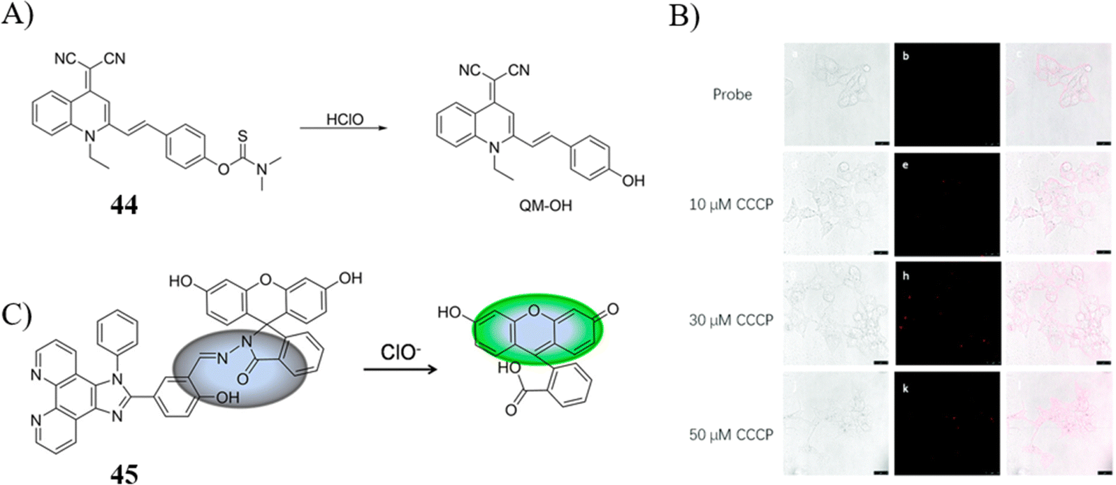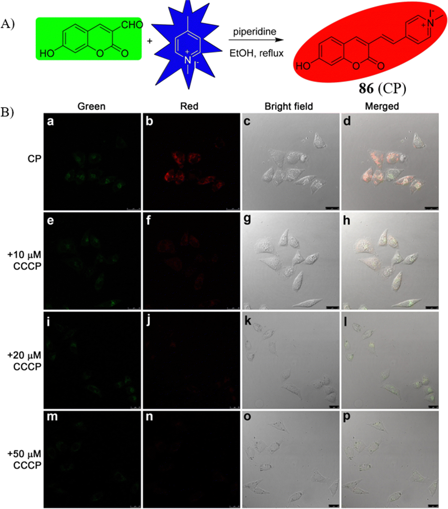 图 47 (A) 探针 86(CP)的合成。 (B) 探针 86(5.0 mM)与 0、10、20 和 50 mM CCCP 培养的共焦图像。