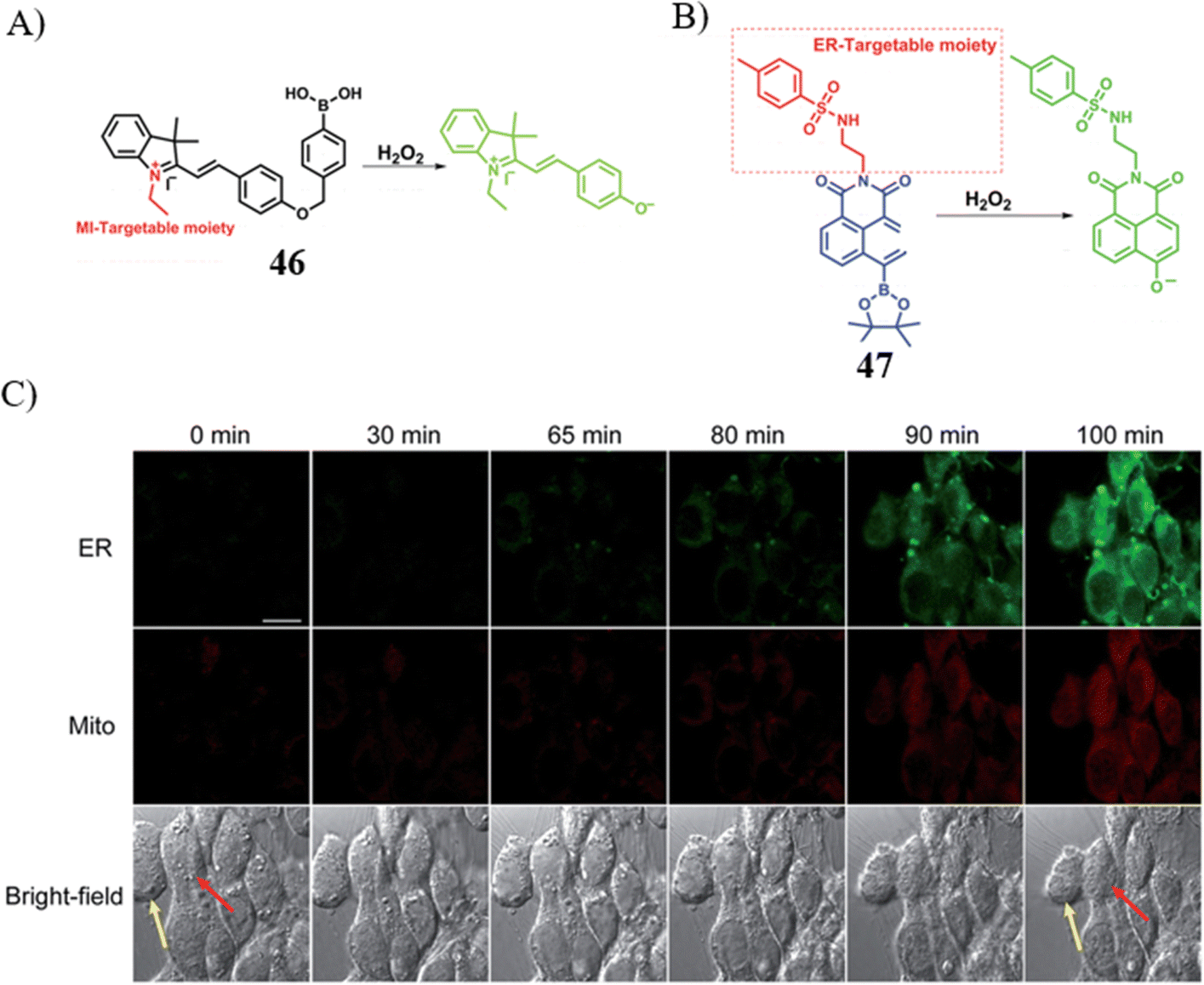 | 47 | H2O2 | ICT | 10 mM PBS, pH 7.4 | 400/458, 558 | 120 nM | — | Endoplasmic reticulum | HepG2 cells, 4T1 cells | |