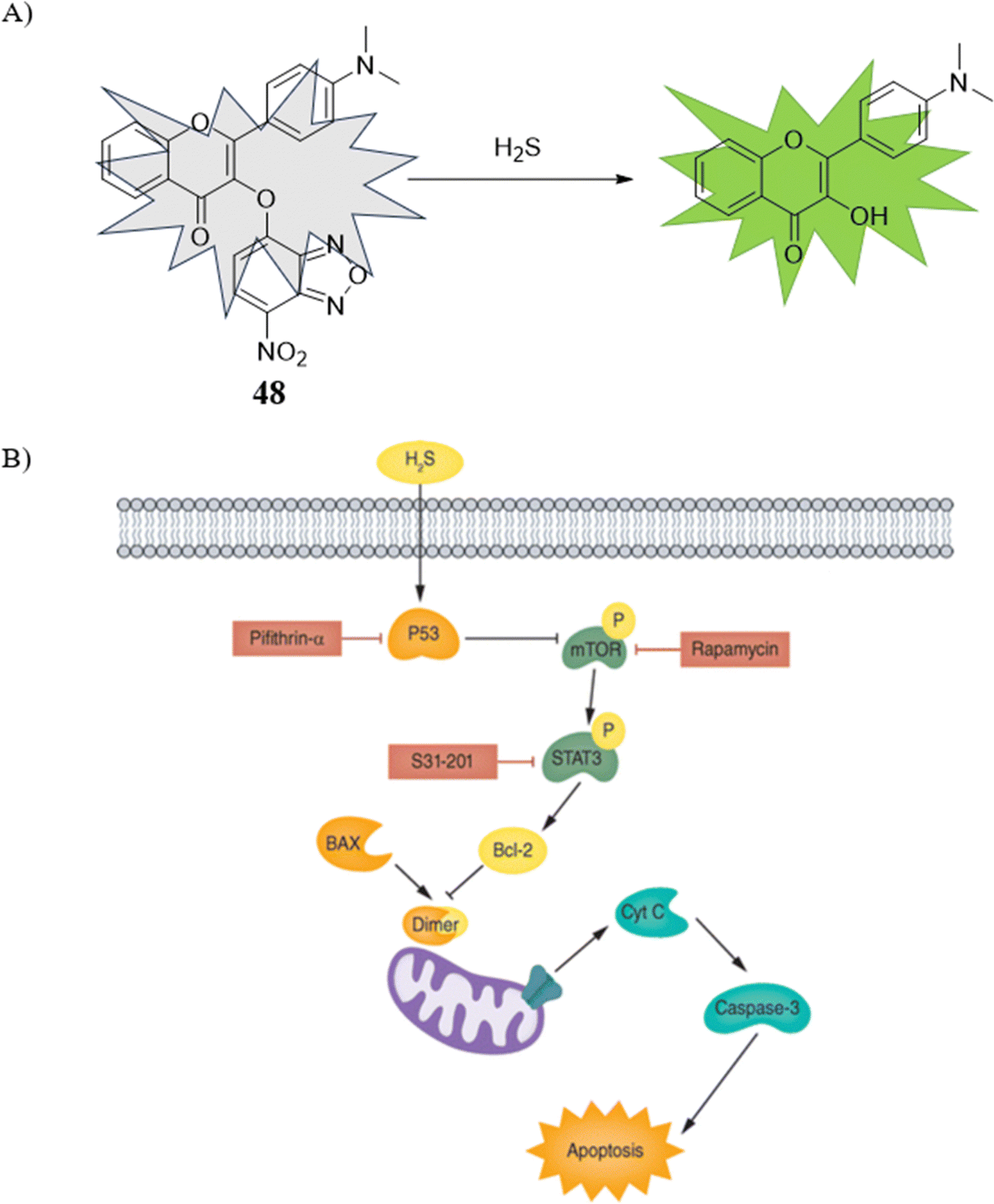 图26. (A) 探针 48 的结构及其识别H2S的机制. (B) H2S在细胞凋亡中的角色。
