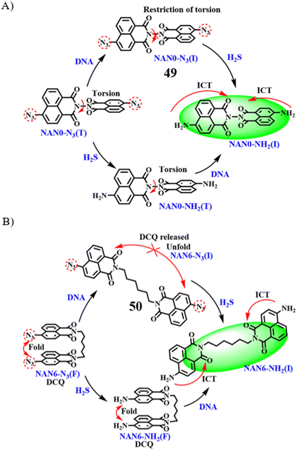 图 27 (A) 探针 49(NAN0-N3)对 H2S 和 DNA 检测的响应机制; (B) 50(NAN6-N3)对 H2S 和 DNA 的响应机制。