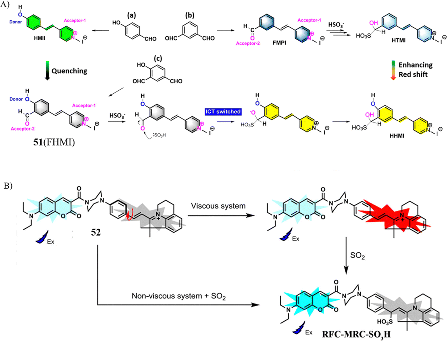 图 28 (A) 探针 51(FHMI)的拟议响应机制; (B) 建议的探针52的响应机制。