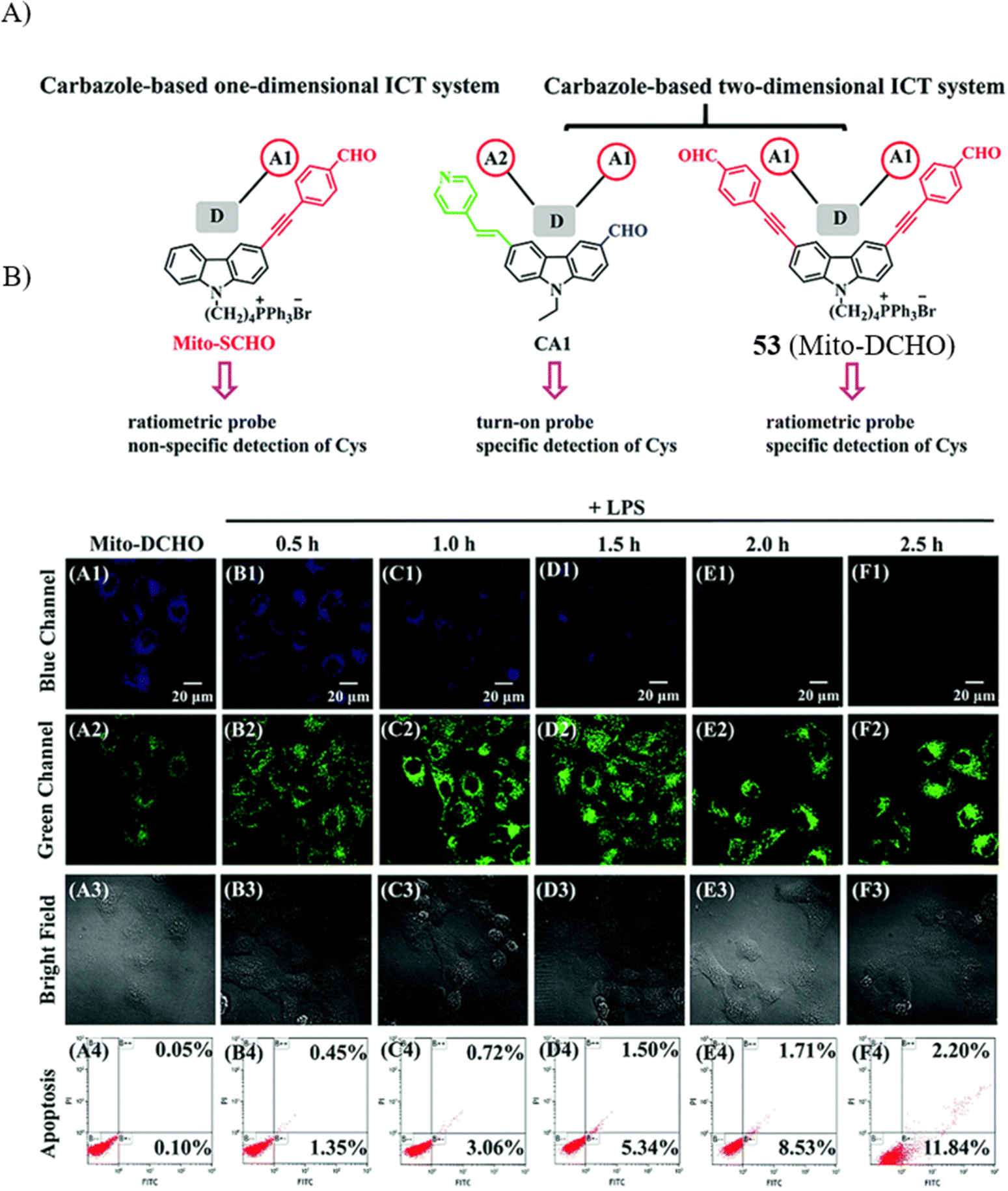图 29 (A)探针 53(Mito-DCHO)的图解; (B) 使用探针 53对细胞凋亡进行双色实时成像。
