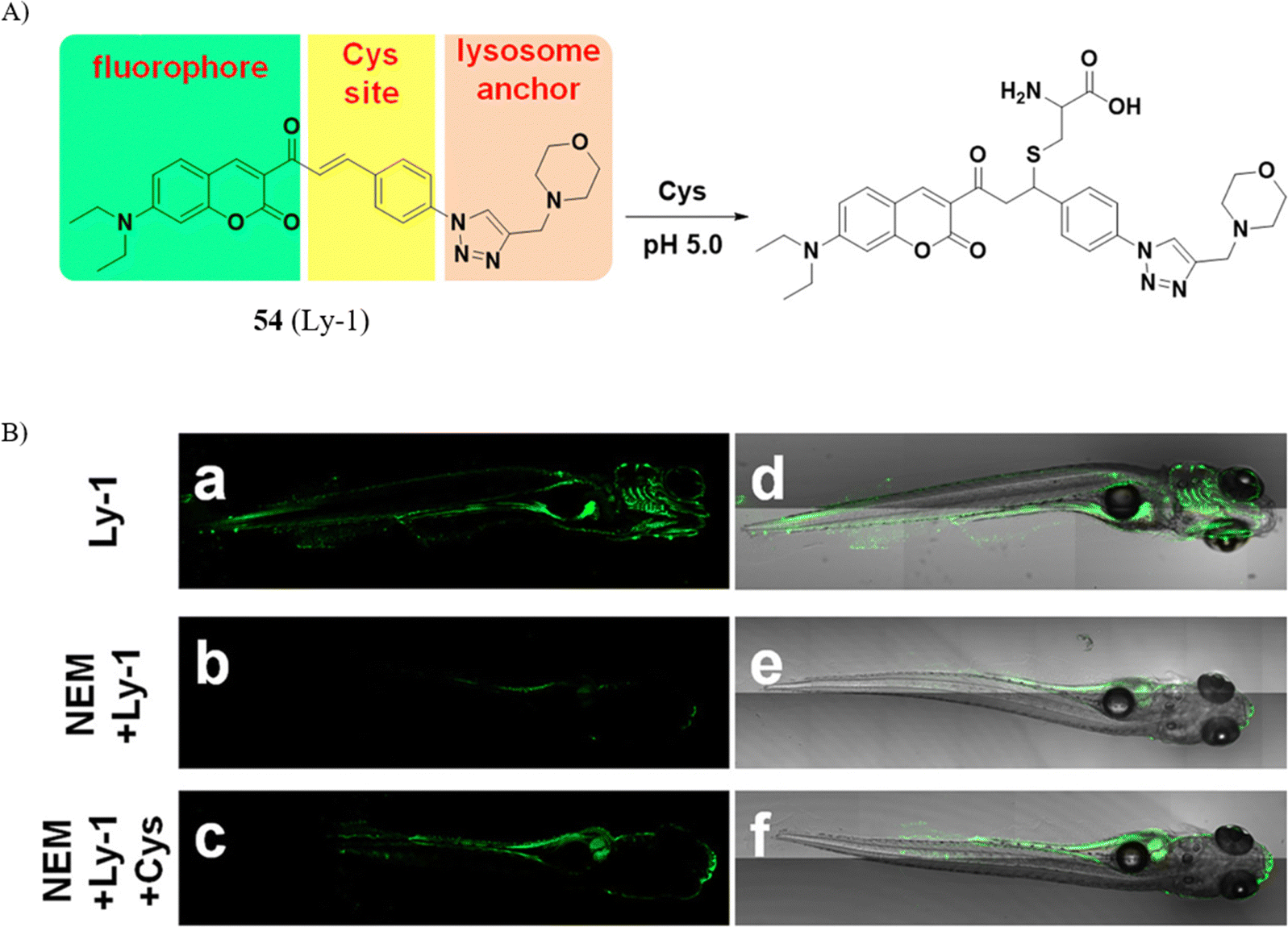 图 30 (A) 探针 54(Ly-1)的结构和 Cys 检测机制; (B) 54在斑马鱼体内的共聚焦荧光图像。