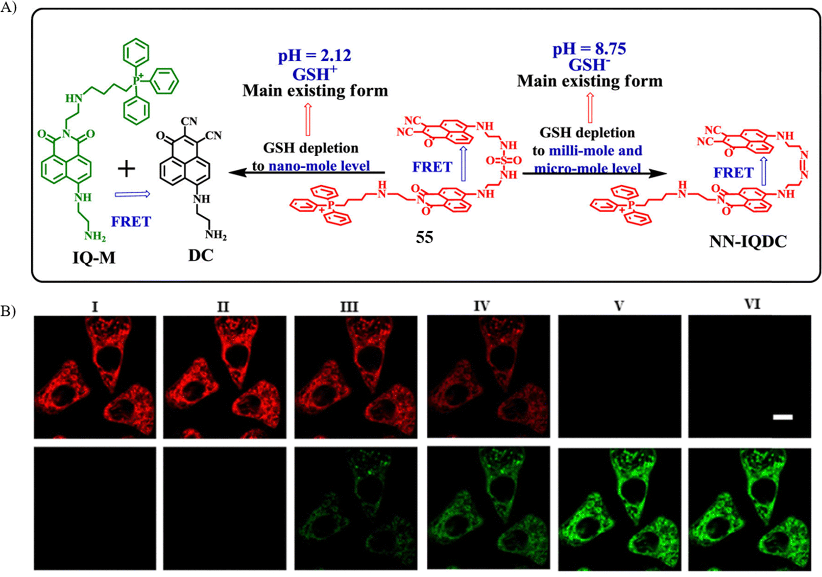 Jiang研究团队开发了一款基于FRET机制的高特异性荧光探针55,用于精准捕捉细胞凋亡早期阶段中谷胱甘肽(GSH)的微小波动。探针设计中巧妙地融合了两个特定荧光团,它们通过磺酰胺基团相连,分别扮演能量供体与受体的角色,能够通过双荧光通道实时监测GSH水平的变化。
