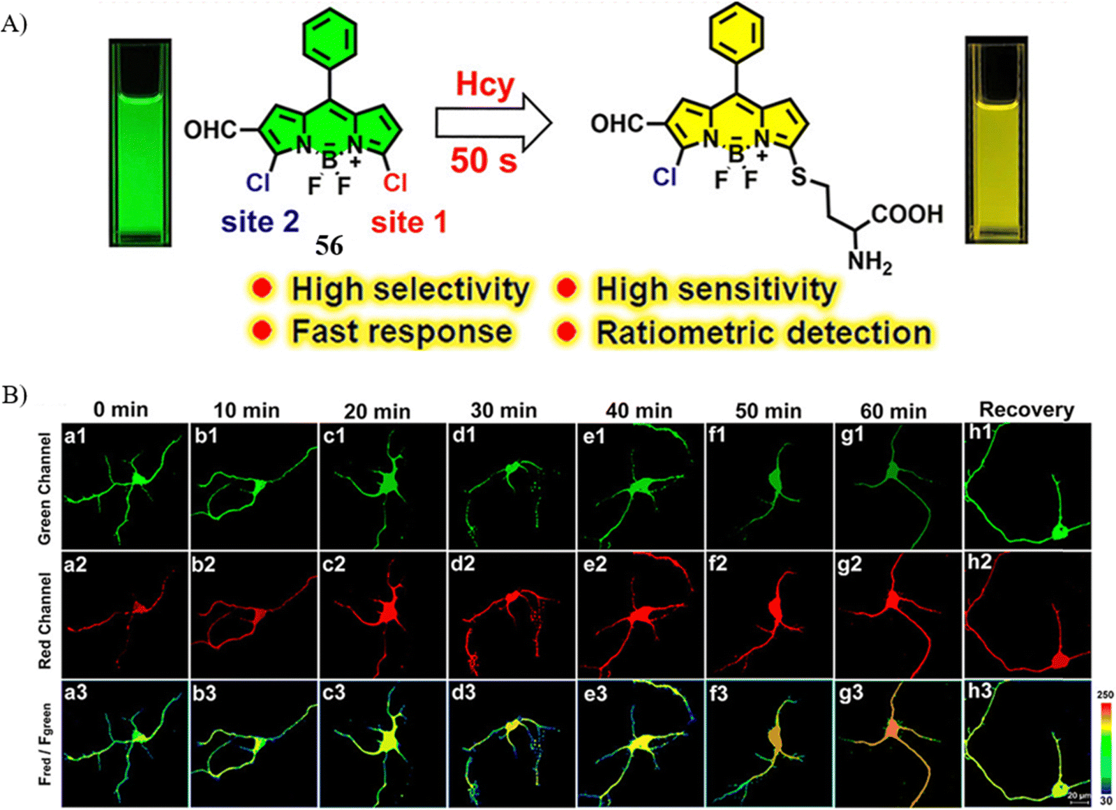 考虑到同型半胱氨酸(Hcy)在生物体内的含量相对较低,且其结构与半胱氨酸(Cys)极为相似,目前市面上缺乏能够特异且灵敏地在生理条件下检测Hcy的优质SMFPs。近期,Tian研究团队设计了一款基于新型BODIPY荧光团的比率型荧光探针56,该探针能够在短短50秒内精准区分活体神经元中的Hcy与Cys以及谷胱甘肽(GSH)。