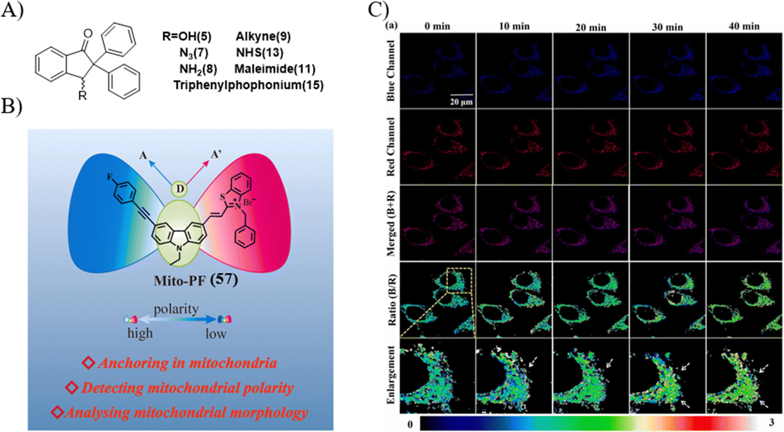 近期研究揭示,线粒体的极性与形态学特征可能构成识别线粒体相关细胞凋亡事件的关键生物标记。Koner研究团队设计了一系列兼具大斯托克斯位移、高量子产率以及良好pH稳定性的多功能荧光探针,适用于线粒体极性的成像,展现出在多种生化应用中的潜力。孟晓明实验室则报道了一款线粒体靶向的TP荧光探针57,该探针能够充当多功能平台,不仅用于量化检测线粒体极性的动态变化,同时还能实现对线粒体形态学转变的可视化。