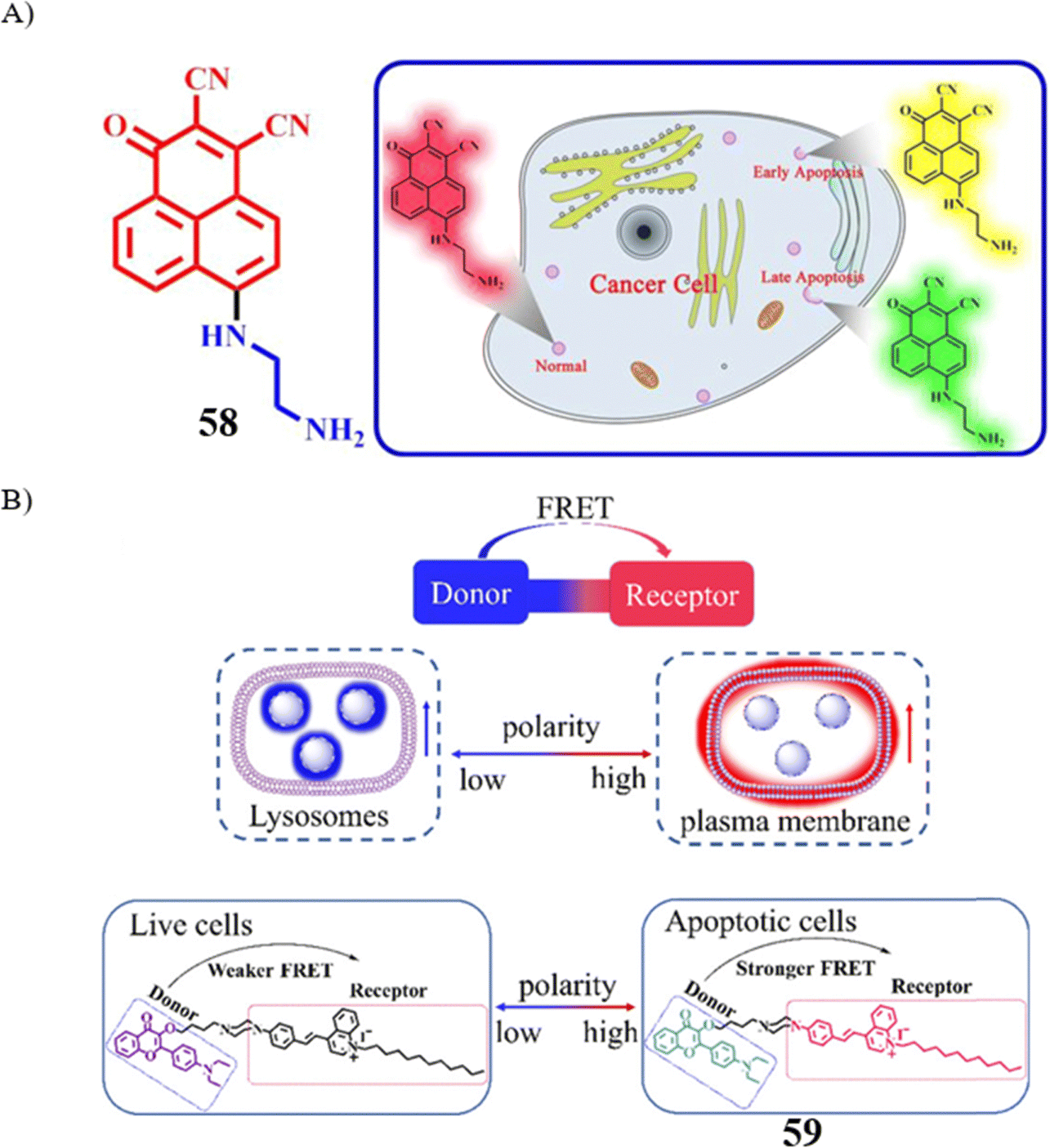 另一方面,Lin研究小组基于FRET机制设计了一款创新的荧光探针59,用于追踪细胞极性的动态变化。探针59在1,4-二氧六环-H2O混合溶液中的光谱测试表明,随着混合溶剂比例从0%变化至90%,其发射颜色明显从红色过渡至青色。引人注目的是,该探针在活细胞的溶酶体中展现出强烈的蓝色信号,而在药物诱导的细胞凋亡过程中,探针能够聚集在细胞质膜上并发出显著的红色信号,从而以双色模式检测凋亡进程。这一特性为细胞凋亡研究提供了直观且有效的监测手段。