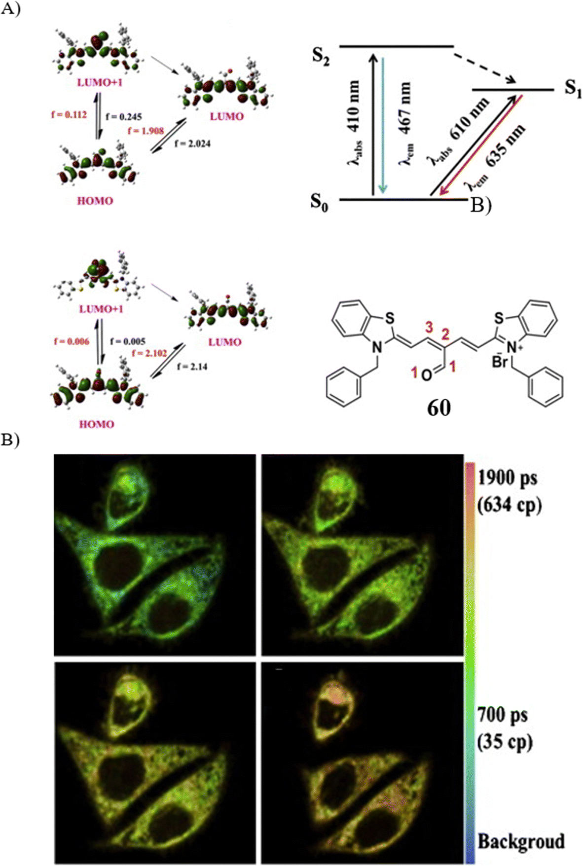 图 35 (A) 探针 60(Mito-V)的理论计算模型和结构; (B) 探针 60的荧光寿命图像。