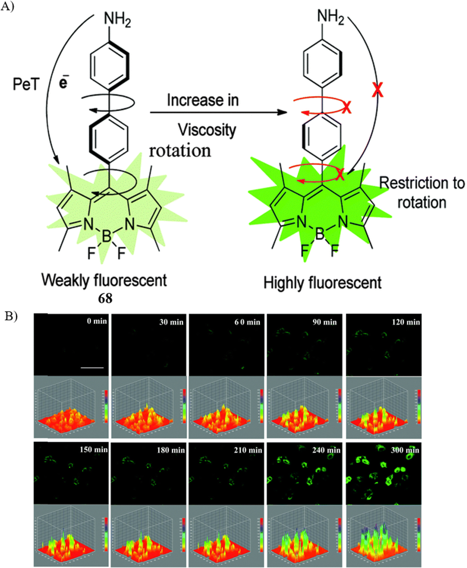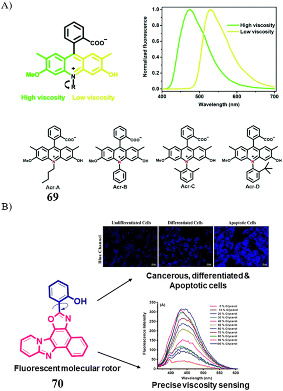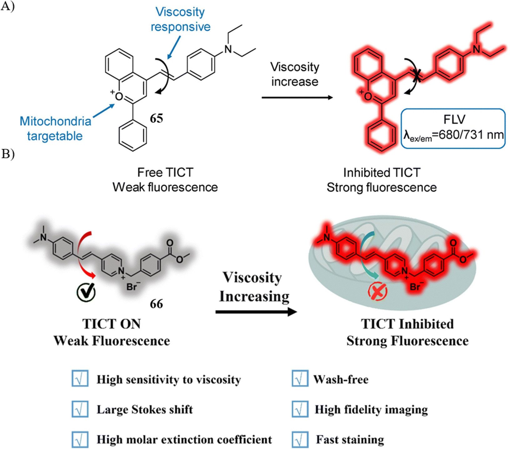 图 38 (A) 用于测量粘度的探针65(FLV)的结构和机理; (B) 66的结构和粘度监测机制。
