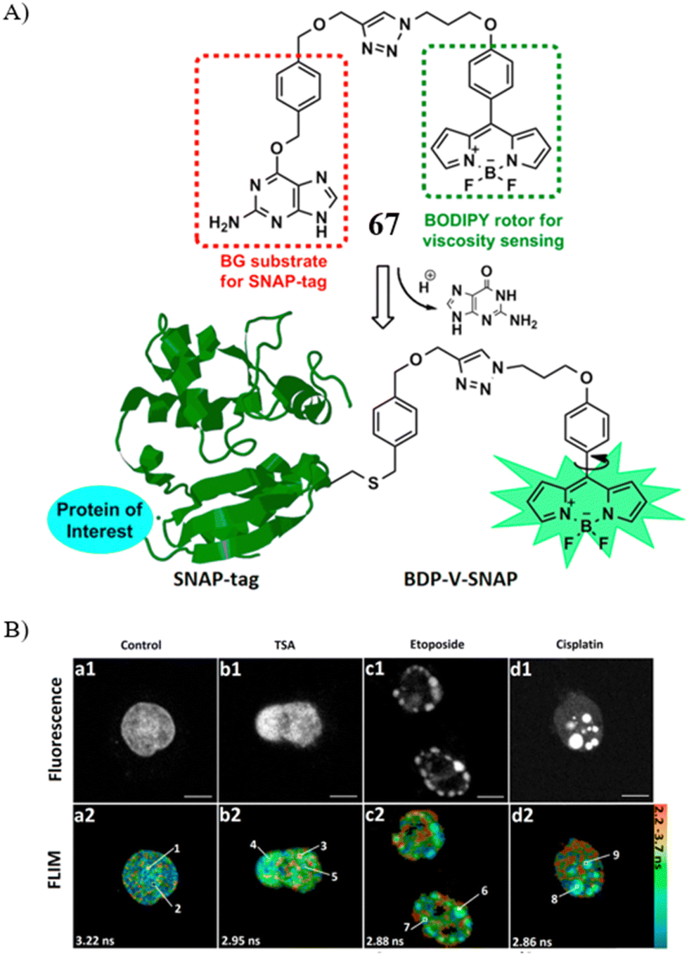 Xiao团队研发了一款创新的粘度敏感探针67,该探针由BODIPY单元与O6-苄基鸟嘌呤构成,旨在通过双光子激发荧光寿命成像(FLIM)技术,实现对SNAP标签融合蛋白局部微粘度的精确检测。实验结果显示,当SNAP-tag融合组蛋白H2B分别与三溴化锡(TSA)、依托泊苷及顺铂共同孵育并在细胞凋亡进程中,其局部粘度出现显著下降,这一变化进一步导致DNA与H2B形成的紧密复合物结构发生紊乱。由此,该探针策略能够以高分辨率在亚细胞层面捕捉特定蛋白质局部微观粘度及其动态变化,为深入理解细胞内部精细机制提供了有力工具。