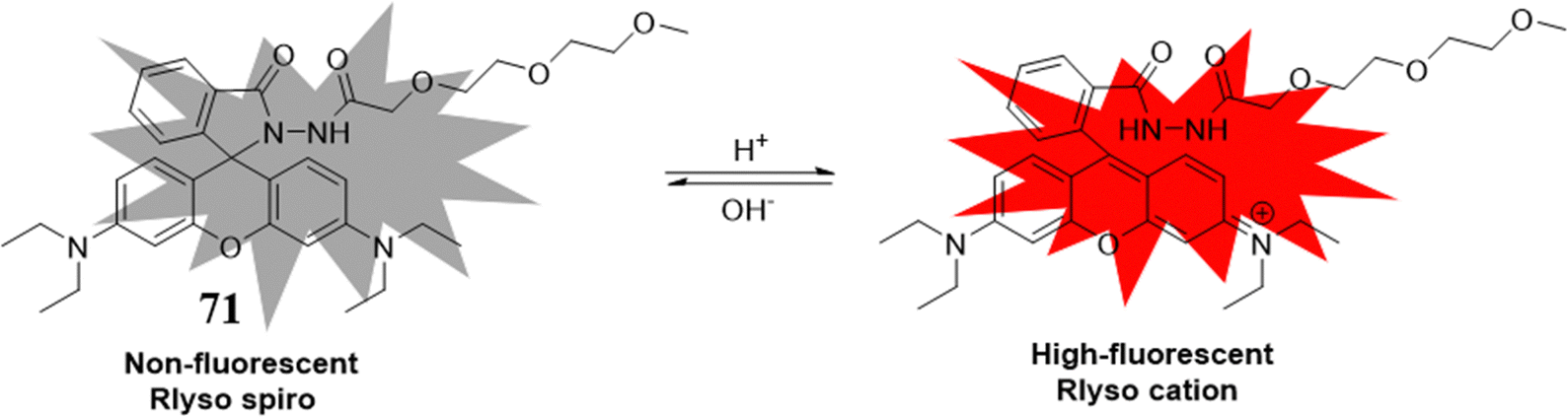 罗丹明染料作为经典的荧光基团,以其对pH变化的敏锐响应而著称。在未与H+接触的“闭环”状态下,罗丹明染料几乎不发光,但一旦与H+共孵育,其螺内酰胺环开环,随即引发显著的荧光增强。基于这一特性,Peng研究团队开发了一款高选择性与高灵敏度的荧光探针71,该探针融合了一个新颖的溶酶体靶向基团。在pH值从7.4降至4.5的过程中,探针在578nm波长处的荧光发射强度提升了逾50倍。更值得一提的是,探针71的pKa值为5.47,这意味着它能够有效监测从4.5至6.0pH范围内溶酶体的正常与异常酸度波动。实验结果证实,该探针不仅能定量追踪氯喹诱导的溶酶体pH变化,还能捕捉活细胞凋亡过程中溶酶体酸度的细微波动,为细胞凋亡研究提供了有力的分析工具。