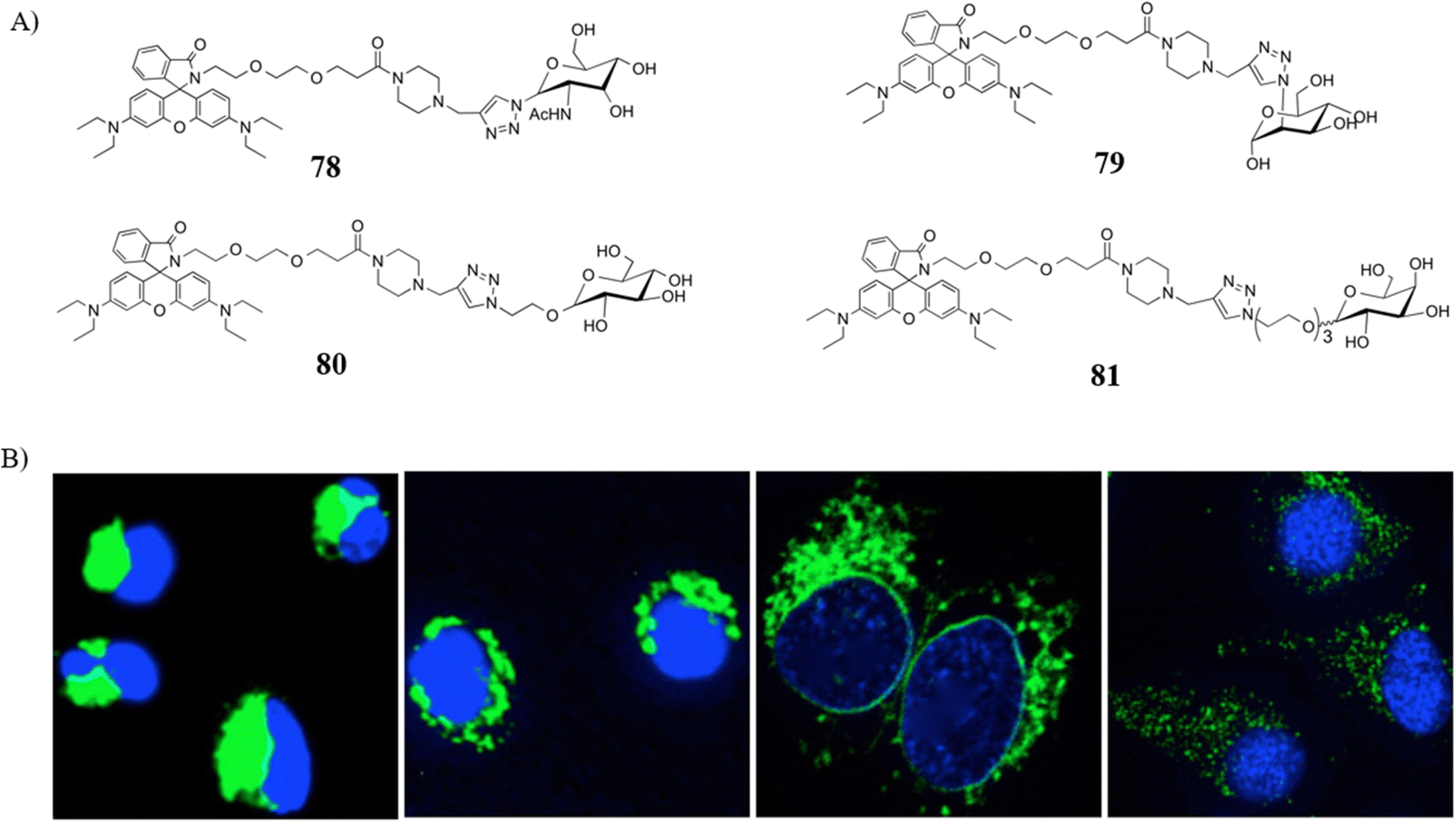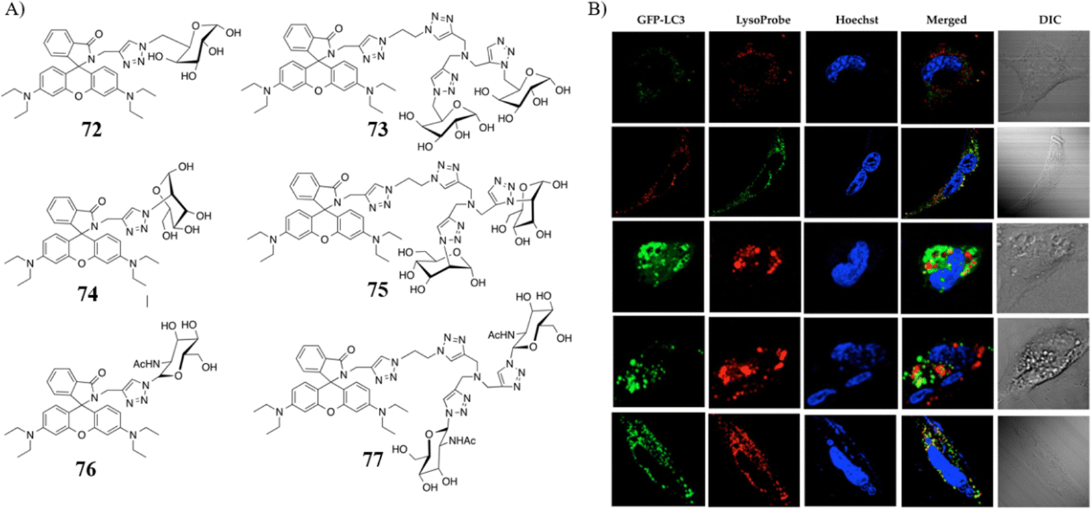 毕研究团队近期报道了一系列创新荧光探针72-77,这些探针巧妙地融合了pH响应结构域与溶酶体靶向模块,基于罗丹明染料设计而成,旨在监测溶酶体内的pH值变化,并评估溶酶体依赖型细胞凋亡过程。与先前设计的探针相比,这批新型探针更侧重于识别溶酶体膜上的糖基化蛋白,这类蛋白富含多种N-连接的糖基,包括但不限于甘露糖、岩藻糖、半乳糖、N-乙酰葡糖胺以及硅藻酸等分子。尤为引人注目的是,这些荧光探针兼具低细胞毒性、高细胞渗透能力、较长的荧光寿命以及在酸性细胞器中特异性富集的特点,展现了在细胞凋亡研究中的巨大潜力。