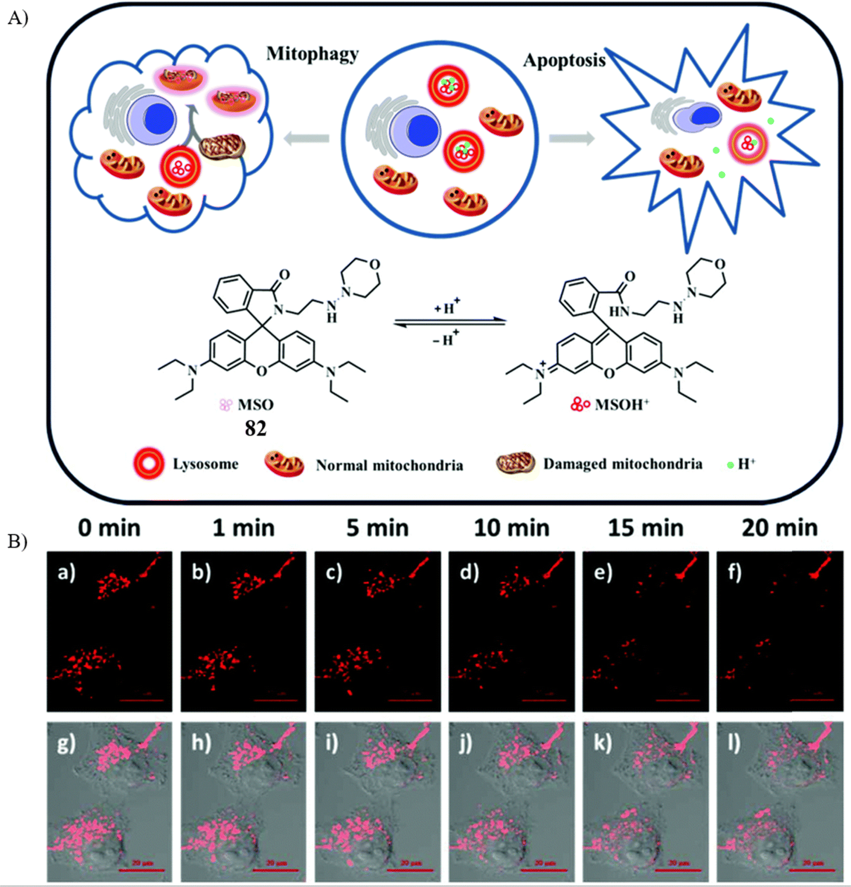 图 45 (A) 探针 82(MSO)的结构和机理; (B) 探针 82(10 μM)在 HeLa 细胞中的实时图像。
