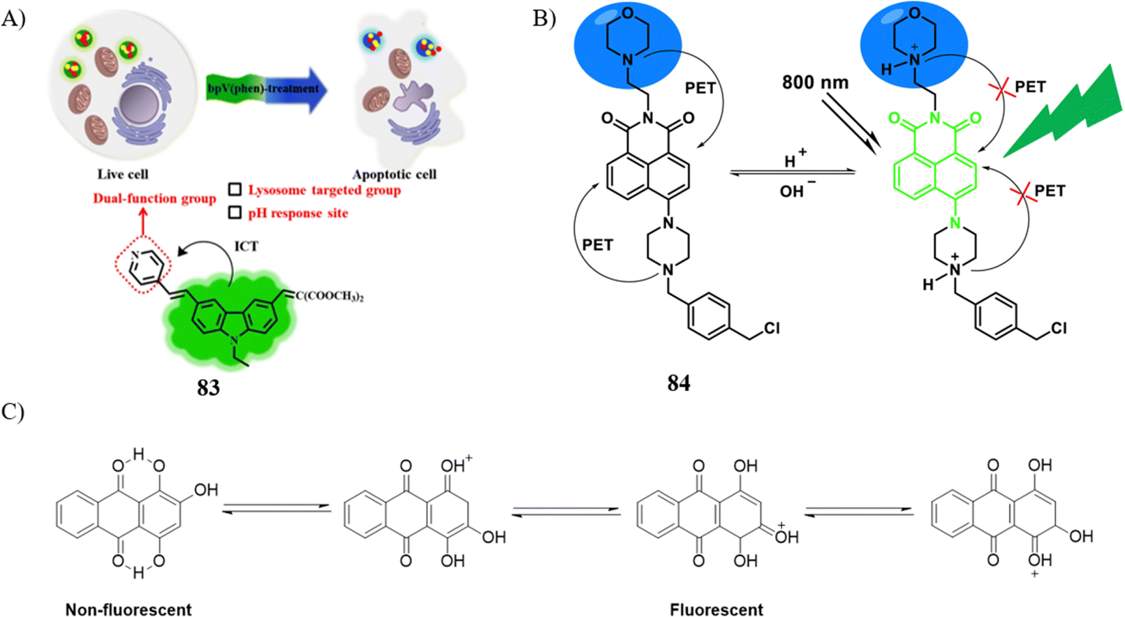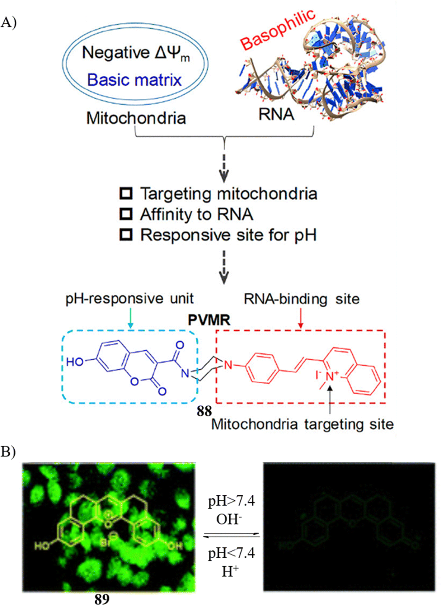 图 49 (A) 探针 88(PVMR)的结构和设计。 (B) 用于 pH 值的89的结构和机理。