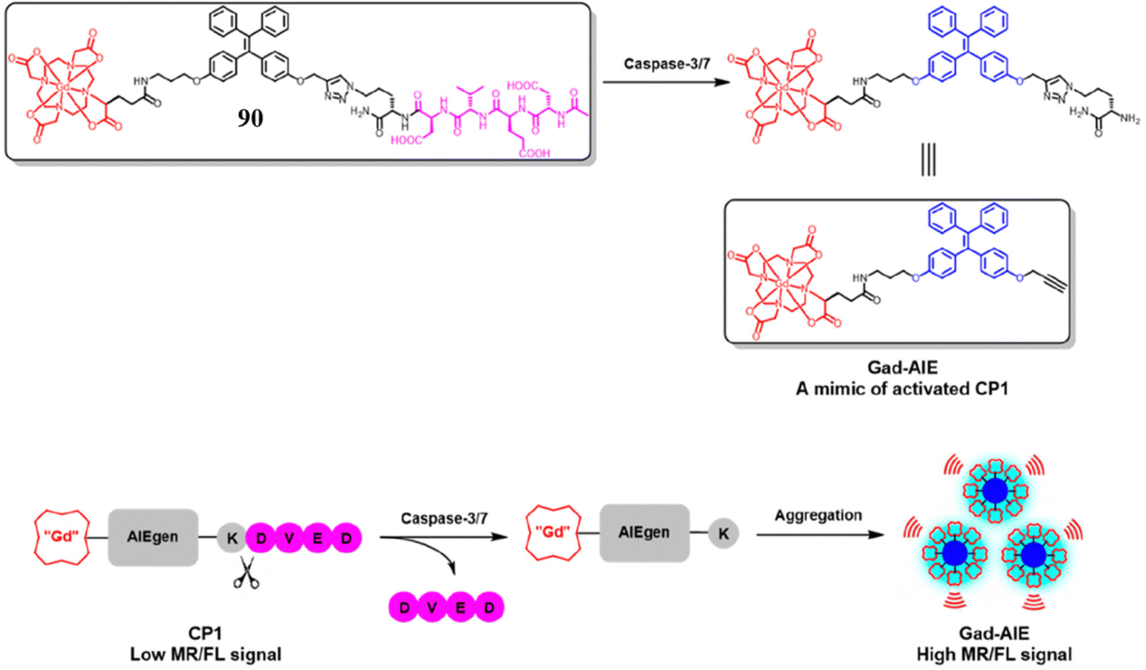 探针90的设计巧妙地集成了三个关键部分:DOTA-Gd(iii)作为磁共振信号增强剂,AIEgen作为荧光信号增强剂,以及DEVD肽作为caspase-3/7酶可裂解的活性链接。这一设计使得探针在caspase-3/7酶的作用下,能够同步触发荧光和磁共振信号的变化。尤为关键的是,荧光信号可以用于精确量化探针在caspase-3检测过程中的活性状态,进而显著提升体外磁共振成像反应的预测精度,为细胞凋亡研究提供了更为精准和全面的分析手段。