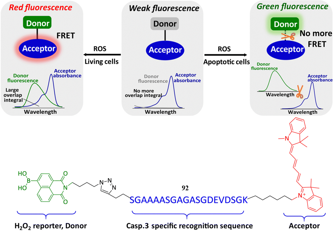 采取“一举两得”的创新策略,能够让我们深入探索细胞凋亡进程中不同生物标志物间的内在关联。Yi研究团队开发了一款多功能FRET探针92,该探针由三个关键部分组成:NP1作为H2O2的荧光报告单元,Cy5作为荧光染料,以及一段特异性识别caspase 3的肽链,旨在同时监测细胞凋亡中的H2O2与caspase 3活性。