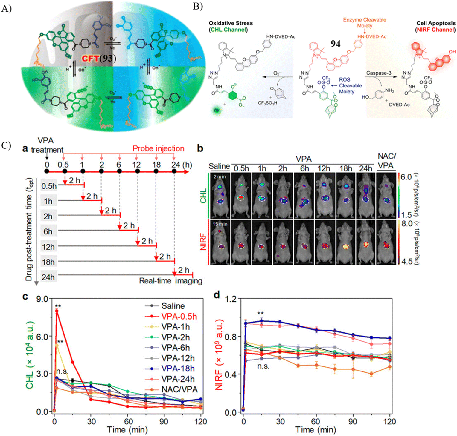 另一方面,Pu等人报道了一款无交叉干扰的双通道荧光近红外探针94,该探针基于相同的近红外荧光染料CyOH,用于实现药物诱导肝毒性(DIH)中O2·-与caspase-3的多重成像。探针94由O2·-可裂解片段与caspase-3激活序列DEVD组成,通过CyOH与近红外荧光发射的连接,旨在探讨氧化应激与细胞凋亡之间的相互作用。在与caspase-3体外孵育后,探针在710nm波长处的近红外荧光信号显著增强,强度约是背景信号的12倍。对药物诱导肝毒性小鼠进行实时近红外荧光与CHL成像的结果显示,O2·-水平的升高远早于细胞凋亡事件的发生,这一发现强调了氧化应激在DIH早期诊断中的重要性。