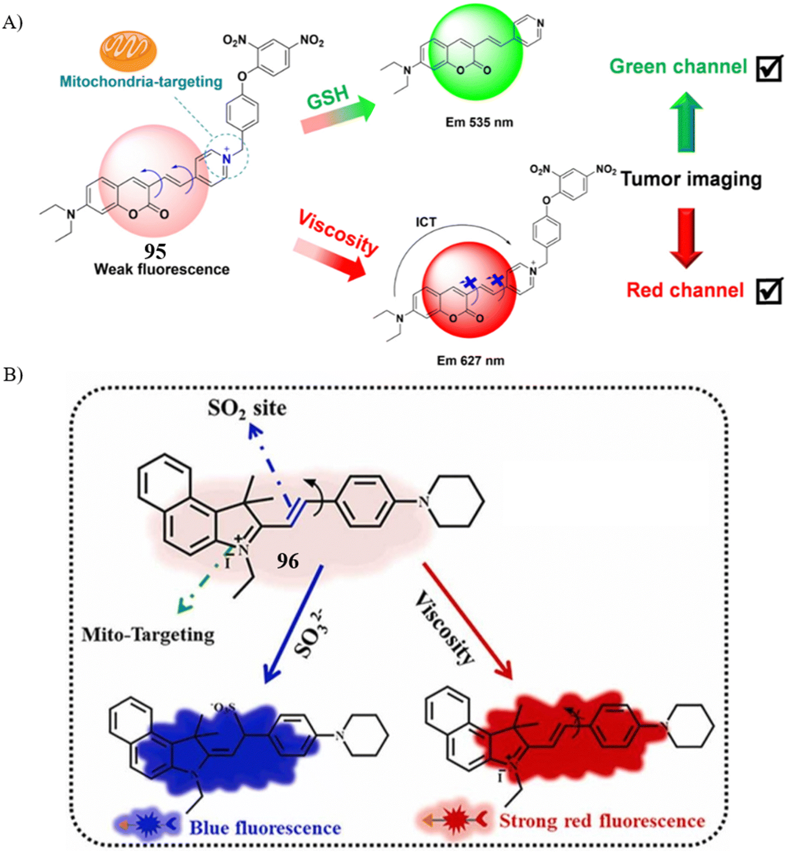 图 54 (A) 探针 95 的结构和机理;(B)96 的结构和机理。