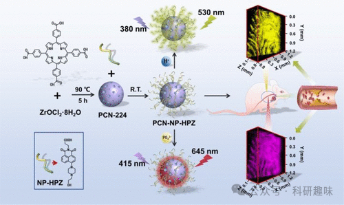 在炎症和胁迫环境中,pH值的变化通常是一个重要的生物标志物,动脉粥样硬化疾病中也不例外。针对这一现象,Tang及其合作者于2023年研发了一种基于MOF(金属有机框架)的双检测荧光纳米传感器PCN-NP-HPZ(如图68所示,探针140),并成功应用于动脉粥样硬化斑块的成像研究。该传感器通过结合pH敏感基团哌嗪和磷酸盐与ZrIV,实现了对pH值和磷酸化的同时高灵敏检测与成像。