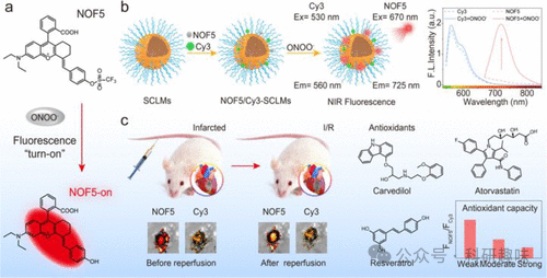 图 58.(a) 129(NOF5)的荧光开启机制。(b) 以 Cy3 为内参构建比率传感器。(c) 心脏中的荧光比率 FNOF5/FCy3 可用于实时监测心脏中 ONOO- 的水平,并就地评估药物的抗氧化能力。