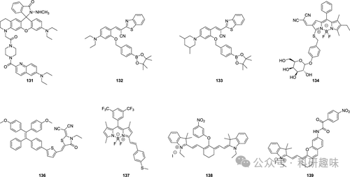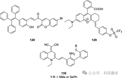 Tang等人在2023年成功研发了两种具备聚集诱导发光(AIE)特性的荧光探针130,旨在监测心肌缺血再灌注损伤(MI/RI)过程中的次溴酸(HOBr)动态(如图59所示)。与多数现有探针的设计不同,这两种探针采用了“关闭”机制,即当HOBr与探针发生氧化反应时,探针的荧光发射被有效抑制。