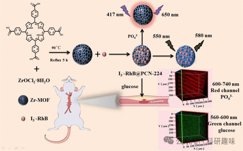 探针141的制备过程采用了对MOF进行后修饰的方法,通过引入碘(I3-)-罗丹明B复合物来实现。该探针能够利用ZrIV与磷酸盐的特异性相互作用来监测磷酸化水平,同时,其I-RhB成分则对葡萄糖展现出高度选择性识别能力。